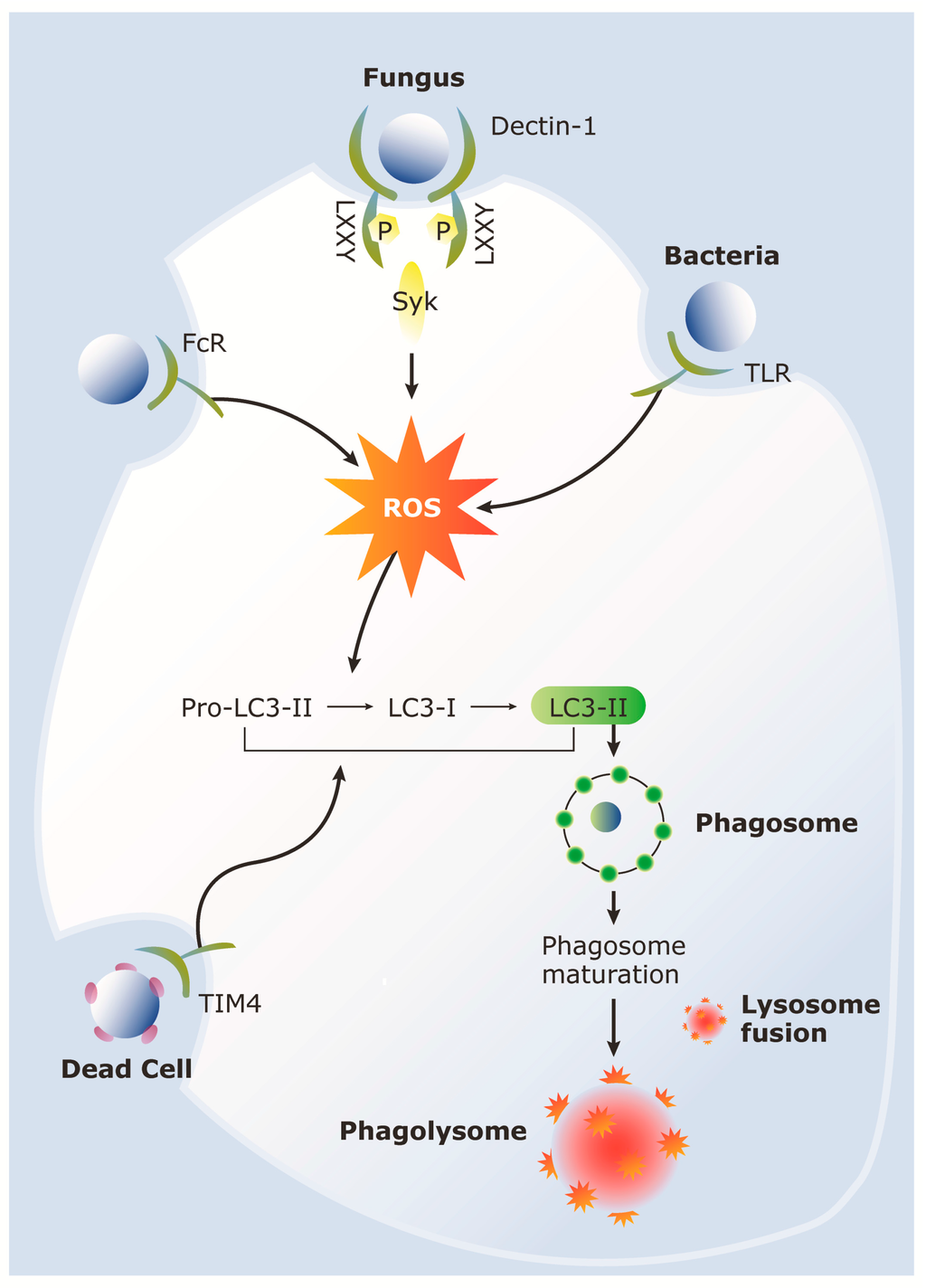 Cell surface receptors recognize a variety of particles inducing LAP. Initiation of LAP leads to ROS generation and subsequent LC3 processing and recruitment of LC3-II to the phagosomal membrane. The phagosome then matures and fuses with the lysosome to form the phagolysosome for particle degradation.