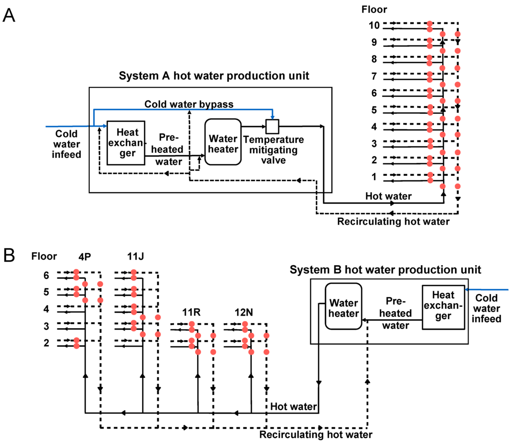 Hot water system schematic for System A (A) and System B (B) where red circles represent the temperature probe location.
