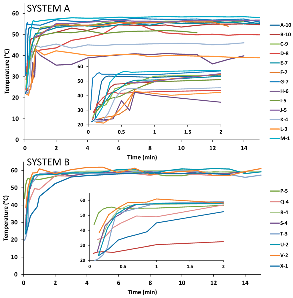 Complete characterization of the sampled faucets was also conducted and is presented in the Supplementary Material (Table S2). As part of the risk classification approach, the measurement of temperatures at the point-of-use provides information on the maximum temperature reached and the time taken to reach this temperature. A temperature of 55 °C should be reached at all taps within 1 to 2 min. Temperature profiles were generated on hot water from 13 taps in System A and eight taps in System B, to evaluate their capacity to deliver appropriate temperatures. Mean temperatures observed on first flush, after 1 and 2 min of flow and the maximum temperature reached at the tap are summarized in Table 2. Detailed temperature profiles are presented in Figure 3.