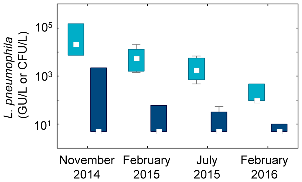 As shown in Figure 4, qPCR results were significantly lower in the samples from February 2016 compared to the previous dates. A reduction of culturable levels is also observed over time in System A, but results were not significantly different when tested with the Kruskal–Wallis test. Nevertheless, levels of culturable L. pneumophila were significantly higher prior to thermal disinfection in August 2014 (p < 0.001) compared to levels measured over the following 18 months (Table 1, Figure 4).