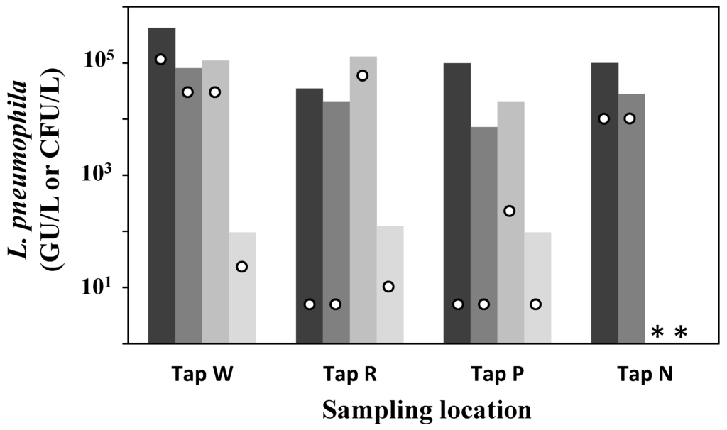 Levels of L. pneumophila in System B by qPCR (bars) and culture (circles) measured at three different points over time: November 2014 (black), February 2015 (dark grey), July 2015 (grey) and February 2016 (light grey). Results below the limit of detection (LD) were represented as 0.5LD; LD = 10 CFU/L and 190 genomic units/L (GU/L). Tap N was not sampled in July 2015 and February 2016 (*) due to the presence of point-of-use filtration at the tap.