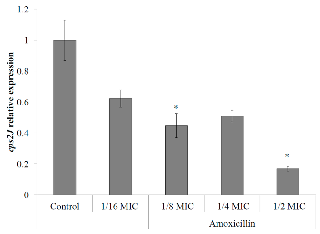 The response of S. suis to sub-inhibitory concentrations of amoxicillin in regard to capsule expression has been quantified by monitoring cps2J gene expression by qPCR following a 6-h incubation. The expression of cps2J by S. suis P1/7 has been found to be dose-dependently down-regulated in the presence of sub-inhibitory concentrations of amoxicillin. Expression of cps2J showed a significant decrease of 80% and 50% in the presence of 1/2 and 1/8 MIC of amoxicillin (6.25 and 1.5625 ng/mL), respectively, when compared with the control assay (no antibiotics) (Figure 1).