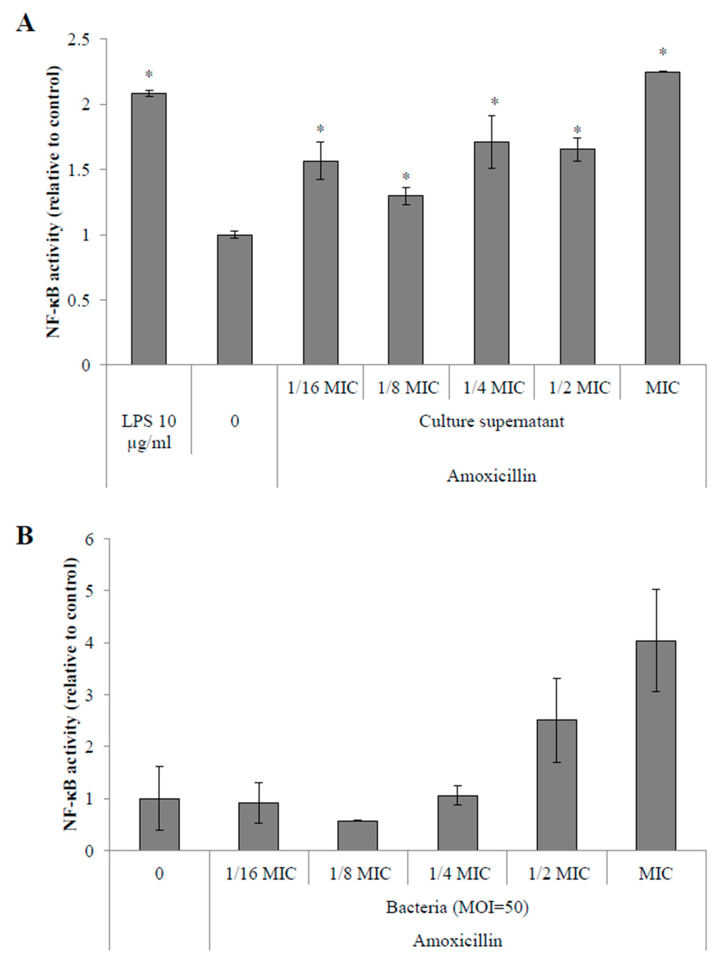 Activation of NF-κB signaling pathway in monocytes stimulated with culture supernatants (A) or S. suis P1/7 whole cells (B) conditioned in sub-inhibitory concentrations of amoxicillin. Escherichia coli LPS was used as a positive control. 0: no antibiotic. *: p < 0.05.
