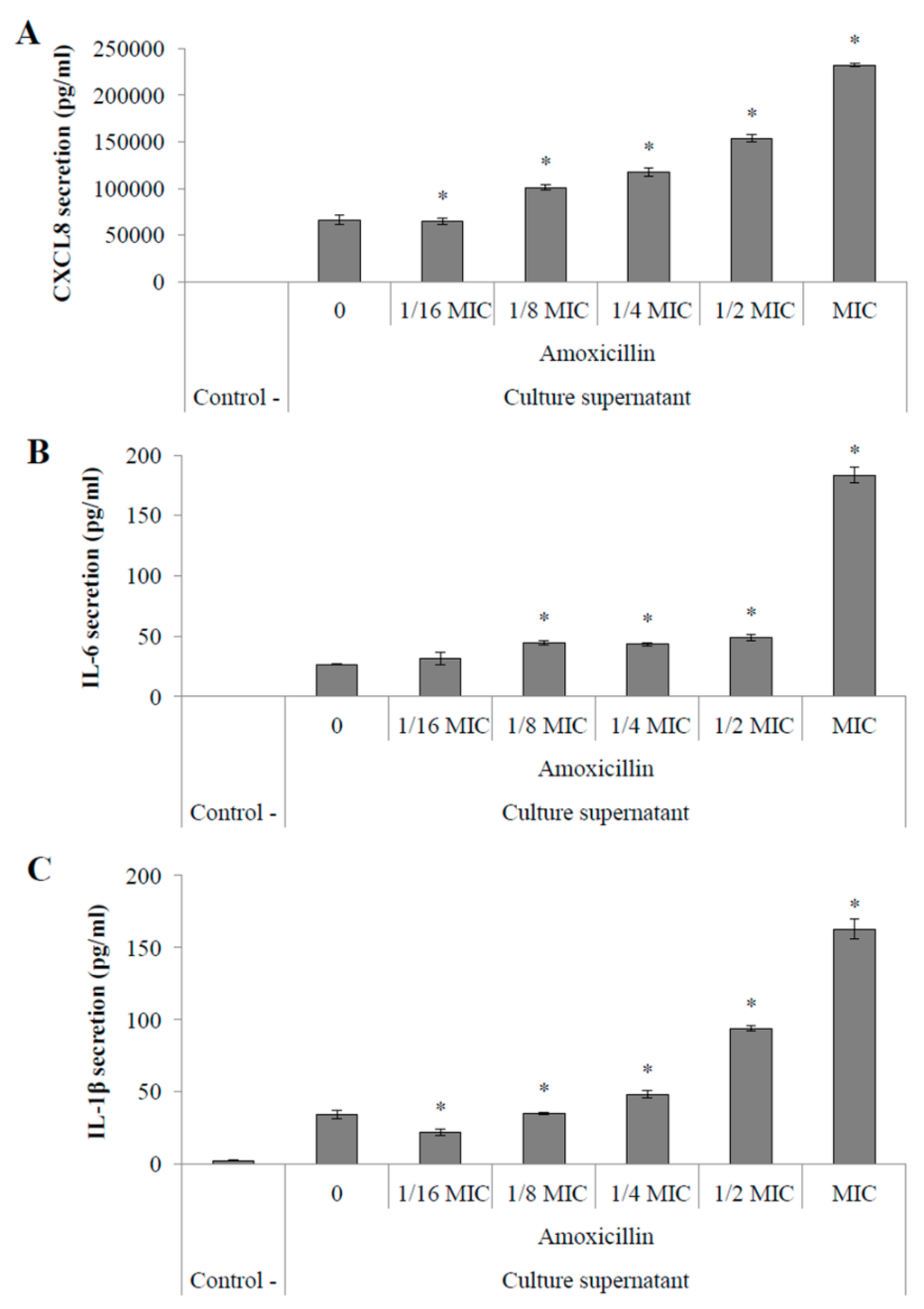 Secretion of pro-inflammatory cytokines CXCL8 (A); IL-6 (B) and IL-1β (C) by macrophages stimulated with culture supernatants of S. suis P1/7 conditioned with amoxicillin. Control - : no stimulation. 0: no antibiotic. *: p < 0.05.