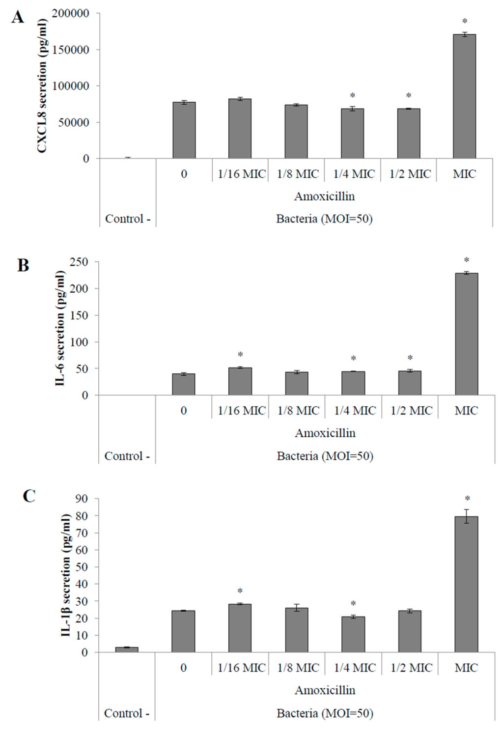Secretion of pro-inflammatory cytokines CXCL8 (A); IL-6 (B) and IL-1β (C) by macrophages stimulated with S. suis P1/7 whole cells (MOI = 50) conditioned with amoxicillin. Control - : no stimulation. 0: no antibiotic. *: p < 0.05.