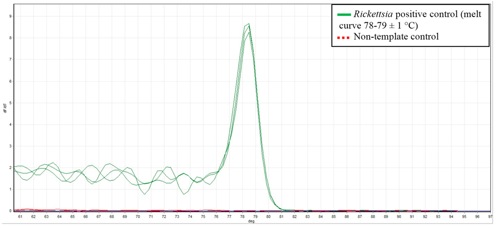 Melt curve data showing the Rickettsia positive control with a Tm of 78–79 ± 1 °C (solid green line) and the no- template control (dashed red line).