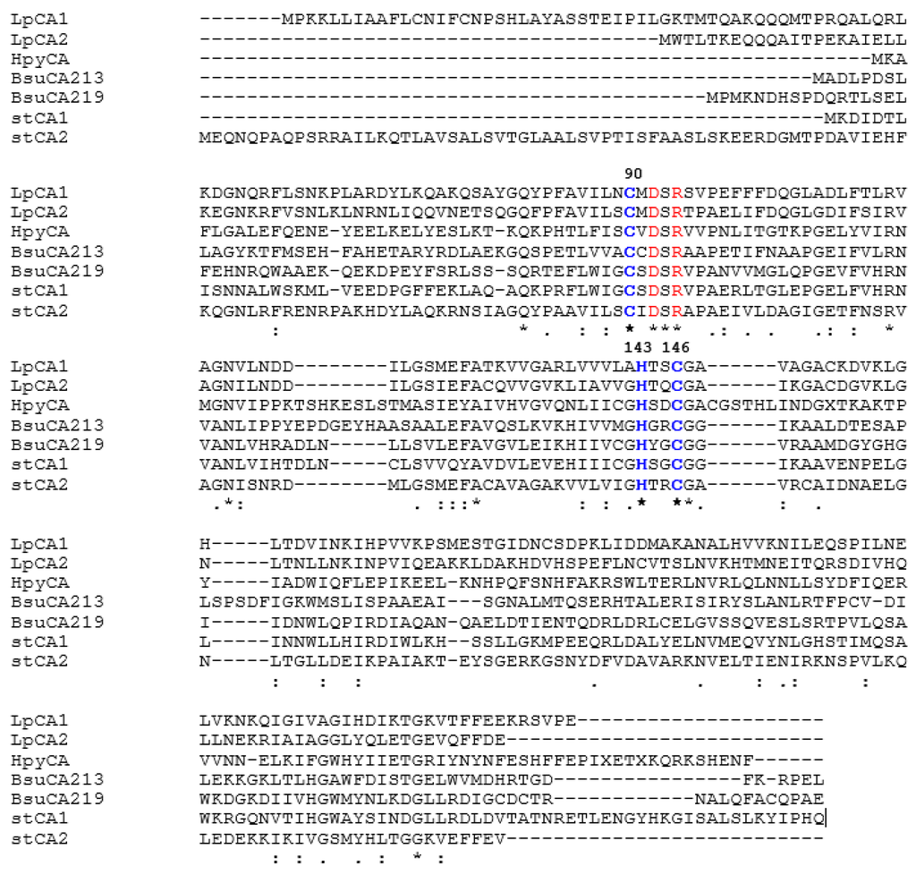 We have aligned the amino acid sequences of LpCA1 and LpCA2 with those of other such enzymes characterized earlier (kinetically, and in some cases also by means of X-ray crystallography), such as HpyCA from Helicobacter pylori [45], BsuCA213 and BsuCA219 (from Brucella suis [46,47]) and stCA1 and stCA2 from the bacterial pathogen Salmonella typhimurium [48,49] (Figure 1). Data of Figure 1 show that, as all other bacterial β-CAs investigated so far, the two Legionella proteins LpCA1 and LpCA2 possess the amino acid residues crucial in the catalytic cycle of CO2 conversion to bicarbonate and protons: (i) the zinc coordinating amino acids, constituted by one His and two Cys residues, more precisely Cys90, His143, and Cys146 (LpCA1 numbering system); and (ii) the catalytic dyad constituted by residues Asp92 and Arg94, which is involved in the activation of the zinc-coordinated water molecule which leads to the formation of the nucleophilic, zinc-hydroxide species of the enzyme [43,44].