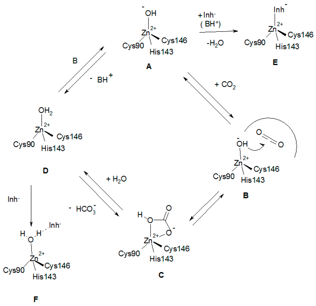 The catalytically active species of the enzyme (A in Figure 3) has a hydroxide ion coordinated to the Zn(II), in addition to the protein ligands (which in Figure 3 are those from LpCA1, i.e., Cys90, His143 and Cys146). This is valid for all CAs belonging to the six different genetic families mentioned in the introduction. In the case of the α-CAs, the zinc hydroxide species is generated through a proton transfer process from the zinc coordinated water to the environment, assisted by the active site residue His64, acting as a proton shuttle [18]. In the β-CAs the activation of the zinc-coordinated water molecule (shown in D in Figure 3) is more complex than for the α-CAs, as the catalytic dyad mentioned earlier (Asp-Arg) takes part in the process. Furthermore, the nature of the amino acid(s) acting as proton shuttles in the β-class enzymes is not completely elucidated [23]. After the nucleophilic attack of the zinc hydroxide species of the enzyme on the bound CO2 (shown in B) bicarbonate is formed (C in Figure 3) which might be bidentately coordinated to the zinc ion (as in the α-CAs) [59]. Inorganic anions are usually weak ligands of the zinc ion in metalloenzymes, so that species C is probably easily converted to species D, by a substitution reaction of the bicarbonate by means of a water molecule. This leads to liberation of the reaction product (bicarbonate) into solution, with generation of the acidic form of the enzyme, D, which is catalytically inactive. To generate the zinc hydroxide, catalytically effective species A, a proton transfer reaction must occur (Figure 3), probably assisted by an active site residue. In the β-CA from the alga Coccomyxa, it has been hypothesized that there are two residues participating in this process, Tyr88 and His92 [60]. However, neither LpCA1 nor LpCA2 possess a sequence of Tyr and His residues close to each other as the algal enzyme, which leads the nature of the proton shuttling residue in these novel β-CAs unknown at this moment. The inhibition mechanism of LpCA1 and LpCA2 (shown in steps E and F in Figure 3) involves the inhibitor substituting the fourth, non-protein zinc ligand, leading to tetrahedral species, as those shown in E. Anions such as acetate bound to Can2 [50], as well as thiocyanate, azide, and phosphate bound to the Coccomyxa β-CA [60], were shown to possess this inhibition mechanism by means of high resolution X-ray crystallography. An alternative inhibition mechanism has been also reported again for the Coccomyxa β-CA for iodide [60], which was found anchored to the zinc-coordinated water molecule/hydroxide ion, as shown schematically in Figure 3, F. This mechanism was observed for phenols [61], polyamines [62], and sulfocoumarins [63] for the inhibition of α-CAs and may be more general than originally considered [23].