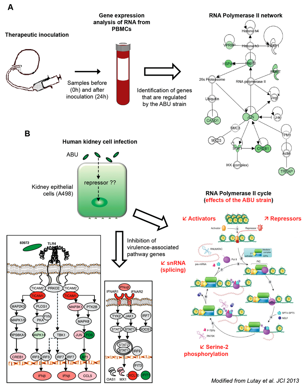 Suppression of gene expression in inoculated patients and infected human kidney cells. (A) Schematic of therapeutic inoculation with the ABU strain E. coli 83972, which established ABU in the inoculated patients. RNA was extracted from peripheral blood mononuclear cells (PBMCs) before and 24 h after intravesical inoculation. Significantly regulated genes were identified by transcriptomic analysis. Genes in the Pol II network were suppressed, by the ABU strain; (B) Human kidney epithelial cells (A498) were infected with the ABU strain E. coli 83972 and significantly regulated genes were identified by transcriptomic analysis, compared to uninfected cells. Pol II transcription cycle with gene categories regulated by ABU indicated in red. ABU infection affected different steps in the Pol II cycle, including chromatin opening, escape from pausing and pre-mRNA splicing. The ABU strain failed to activate/inhibit the pathology-associated TLR4 and IFN-β pathways. Adapted from Lutay et al. [14].