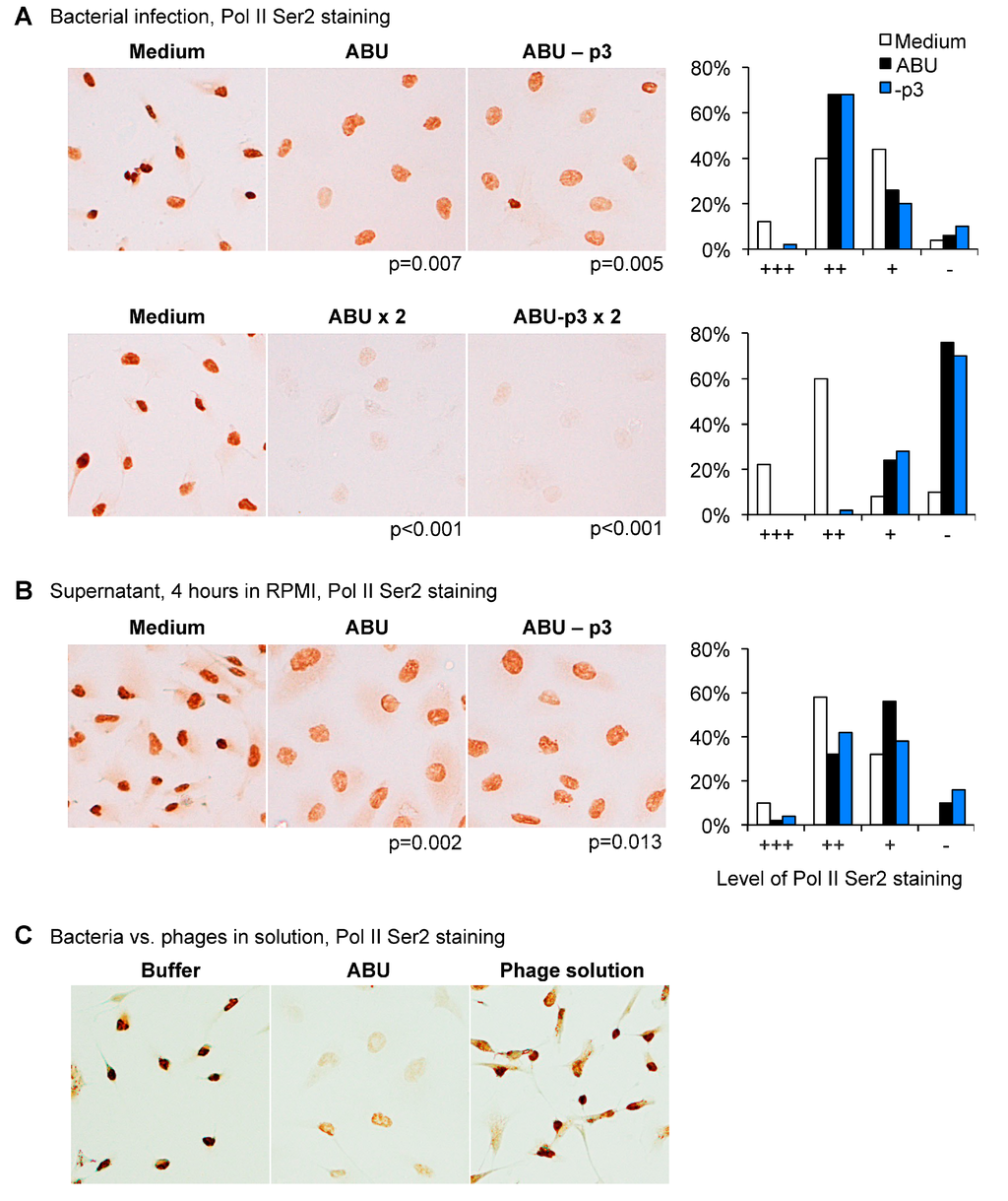 Pol II phosphorylation is not altered by the Prophage 3 deletion. (A) The Pol II Ser 2 staining intensity (brown) did not differ between cells infected with the ABU strain or the -Prophage 3 deletion mutant (109 and 2 × 109 CFU/mL, n = 100 cells, p-values by χ2 test). Histograms show the distribution of human kidney epithelial cells according to their Pol II Ser 2 staining intensity (+++ = highly stained, - = no staining); (B) Supernatants of A498 cells infected with the ABU strain or the ABU-Prophage 3 deletion mutant. Similar effects on Pol II phosphorylation (109 CFU/mL, n = 100 cells, p-values by χ2 test). Pol II Ser 2 staining was quantified by immunoperoxidase staining using Pol II Ser2specific antibodies; (C) Pol II Ser 2 phosphorylation was not inhibited by lytic phage particles released by the ABU strain during growth in human urine, in vitro.