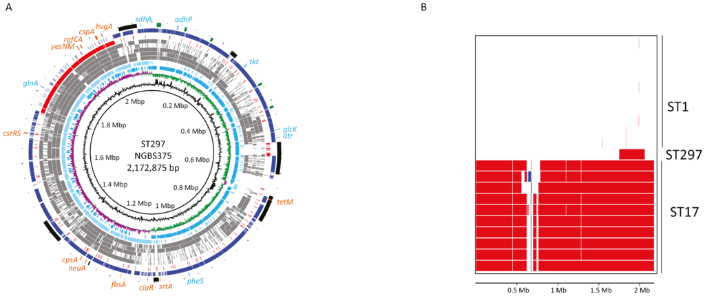 2.1. Genome Comparisons Show that Strain NGBS375 Has an ST1 Genome Backbone but Has Acquired an Area of 308,916 bp by Homologous Recombination from an ST17 Donor