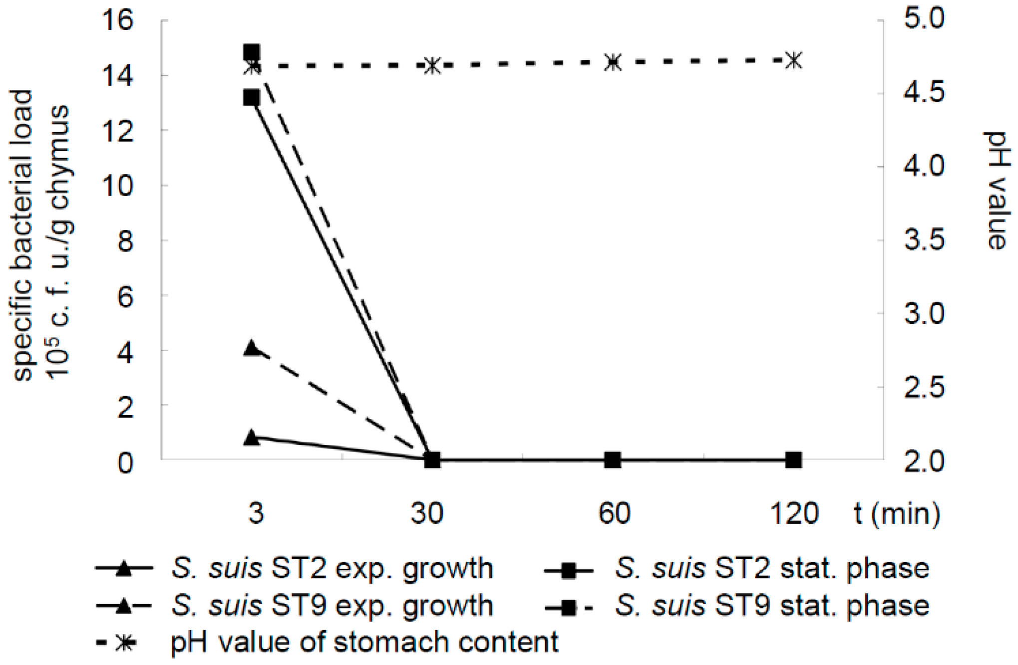 Based on our results, S. suis serotypes 2 and 9 did not survive in stomach contents with a pH = 5 for 60 min, though stable numbers of viable, stationary phase bacteria were recorded in THB with a pH = 5. Thus, porcine gastric fluid exhibited further bactericidal effects on S. suis in addition to a low pH. This has also been shown for Salmonella Typhimurium mutants [22] and Listeria monocytogenes [31].