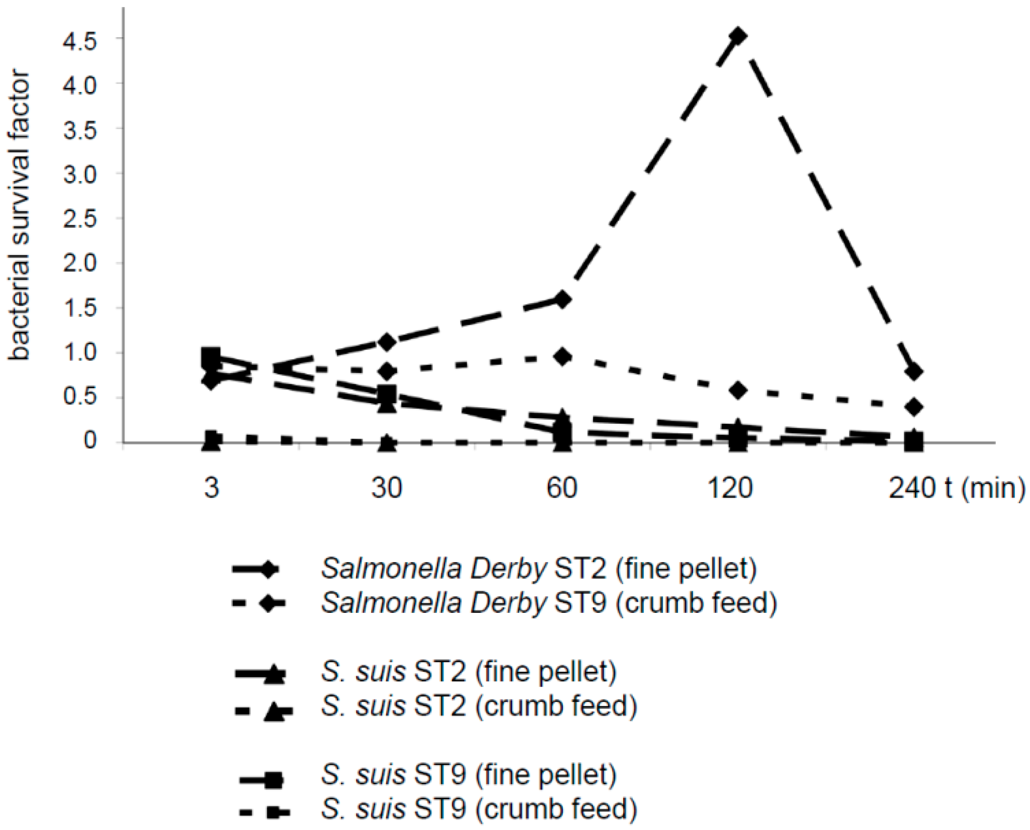 As S. suis is a common bacterium in the oral and nasal cavity of piglets, contamination of feed with S. suis is a likely process during feeding. We monitored the survival of S. suis in two kinds of compound feed in comparison to the survival of Salmonella Derby, as salmonellae are known to be transmitted via contaminated feed. Though feed might be contaminated with the two pathogens by different mechanisms, a comparison with salmonellae was included to demonstrate bacterial survival in the stomach contents under specific conditions.
