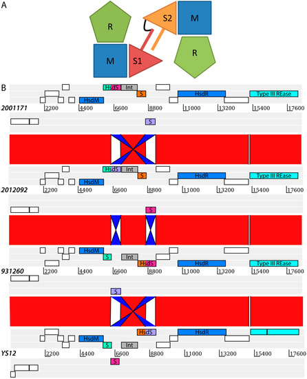 (A) Schematic representation of a Type I R–M system inspired by Loenen et al. [6]. A typical Type I R–M system is a pentameric protein complex consisting of two R subunits, two M subunits and an S subunit encoded by hsdR, hsdM and hsdS genes, respectively. The S subunit consists of two target recognition domains (TRDs), each of which can recognize a different DNA sequence. The two TRDs of the S subunit here are indicated by S1 and S2, separated by a bar which represents a separating amino acids sequence. The two TRD domains are covalently linked as illustrated with a black linker sequence; (B) Alignment of the prophage loci of four representative isolates containing four variants of the SsuCC20P Type I R–M system. DNA sequences are aligned using the Artemis Comparison Tool [18] which illustrates the DNA inversions that have taken place and resulted in four different hsdS genes. A complete hsdS gene consists of two Methylase_S (pfam01420) target recognition domains (TRDs), which are colored in the figure to illustrate the rearrangements. The putative four complete S subunits for each of the isolates are respectively; i: green/pink in isolate 2001171, ii: green/purple in isolate 2012092, iii: orange/pink in isolate 931260 and iv: orange/purple in isolate YS12. The two genes indicated in blue are the hsdM and the hsdR gene, respectively. The gene highlighted in cyan is a Type III restriction endonuclease. An integrase (tyrosine recombinase), which likely facilitates the demonstrated DNA inversions is indicated in grey. The complete annotation from 5′ to 3′ is presented in Supplementary Table S1.