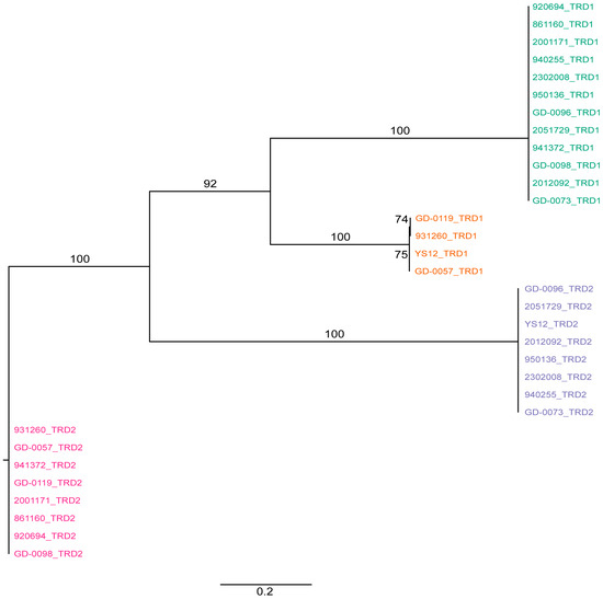 We extracted the sequences of the TRDs from the hsdS genes to determine whether, within gene domain, movement occurred, similar to what was observed previously in Helicobacter pylori [19]. We found a conserved region in the nucleotide alignment between the TRD’s of 17 nucleotides in length (AGATAAATCATCATTTA) and two shorter conserved nucleotide sequences (ATTCAAAAGTTA and TCAGGCGA) at the 3′ end of the hsdS genes (Supplementary Figure S1). There was no evidence for repeat sequences in the S subunit, suggesting SsuCC20P is a Group 1 Type I RM system as defined by Furuta et al. [19]. This lack of repeat sequences further suggests that recombination occurs only within TRD1s and within TRD2s, but not across TRD1 and TRD2, within the four variants of SsuCC20P. This hypothesis is supported by phylogenetic analysis of all TRD1s and TRD2s (Figure 2), which shows clustering of TRDs.