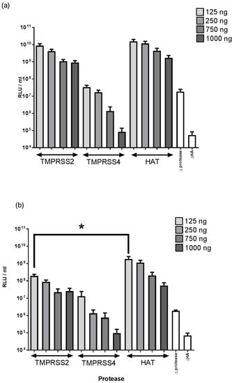 - Böttcher, E.; Matrosovich, T.; Beyerle, M.; Klenk, H.-D.; Garten, W.; Matrosovich, M. Proteolytic activation of influenza viruses by serine proteases TMPRSS2 and HAT from human airway epithelium. J. Virol. 2006, 80, 9896–9898. [Google Scholar] [CrossRef] [PubMed]