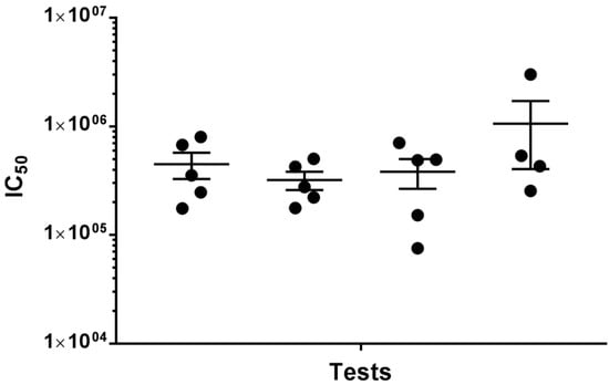 Neutralisation titres (50% inhibitory concentration, IC50) obtained using a positive control serum in four independent PVNTs using a PV expressing A/equine/Richmond/1/2007 (H3N8) HA (produced with an endogenous HAT protease-encoding plasmid and an exogenous source of NA). The PV RLU input ranged from 1.83 to 3.43 × 105, and the serum dilution range was 1:800 to 1:6,553,600. Individual data points represent the IC50 calculated from each of the 5 (or 4) internal PVNT repeats. Horizontal line indicates mean IC50 and whiskers represent the standard error of the mean.
