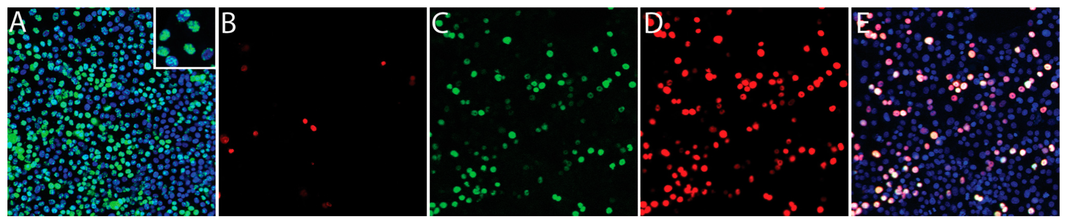 Characterization of a conventional de novo primary latent Kaposi’s sarcoma-associated herpesvirus (KSHV) infection. Vero cells were infected with gradient-purified KSHV for 48 h and then sequentially stained for the latency marker ORF73 (A; green) and the lytic marker ORF59 (B; red). KSHV-infected cell cultures were super-infected with baculovirus BAC50, which expresses the recombinant KSHV ORF50 transactivator, to induce lytic replication. The induced cells were fixed and sequentially stained for ORF50 (C; green) and ORF59 (D; red). Co-localization of the ORF50 and ORF59 staining is shown in panel E (white). Cell nuclei are stained with TO-PRO 3 (A,E; blue).