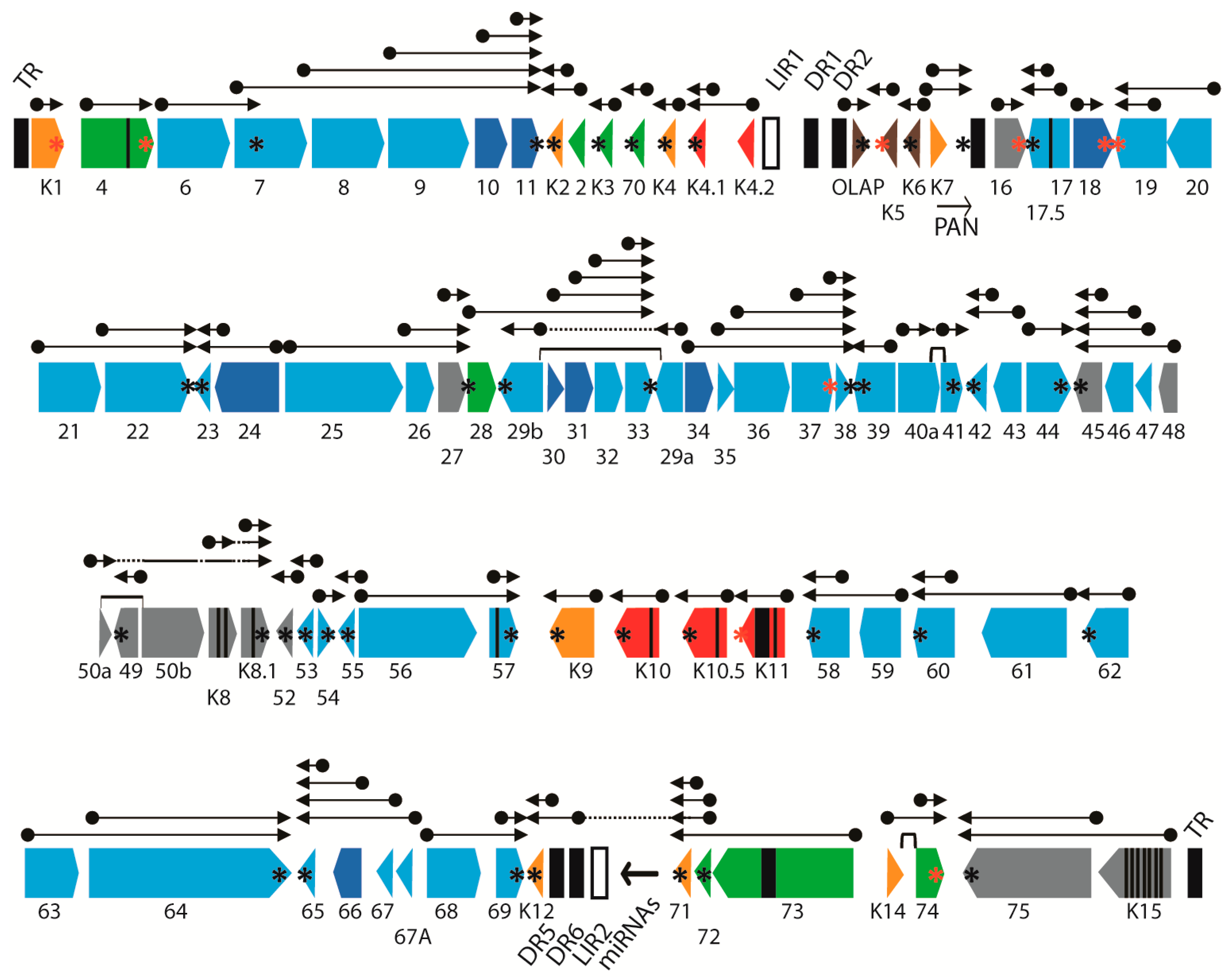 Map of the KSHV genome. The positions and transcription directions of the ORFs identified in the KSHV genome are shown. Vertical black lines within an ORF indicate splicing events or internal initiations, while longer range splices of protein-coding exons are indicated with bars. The positions of known polyadenylation (pA) sites of transcription termination are indicated with an asterix (AATAAA = black; ATTAAA = red) (see Table 2). The ORFs are color coded with regard to their conservation in other herpesvirus genomes, showing core genes conserved in the herpesvirus family (light blue), genes conserved in beta- and gamma- herpesviruses (dark blue), gammaherpesviruses only (grey), gamma-2-herpesviruses (green), RV1 and RV2 rhadinoviruses only (orange), RV1 rhadinoviruses only (red) and KSHV-only (brown). A current view of the complex pattern of gene transcription is indicated with arrows, which initiate at unique promoter elements (dots) and terminate at unique or shared pA sites. The terminal repeats (TR), direct repeats (DR) and long-inverted repeats (LIR) are indicated.