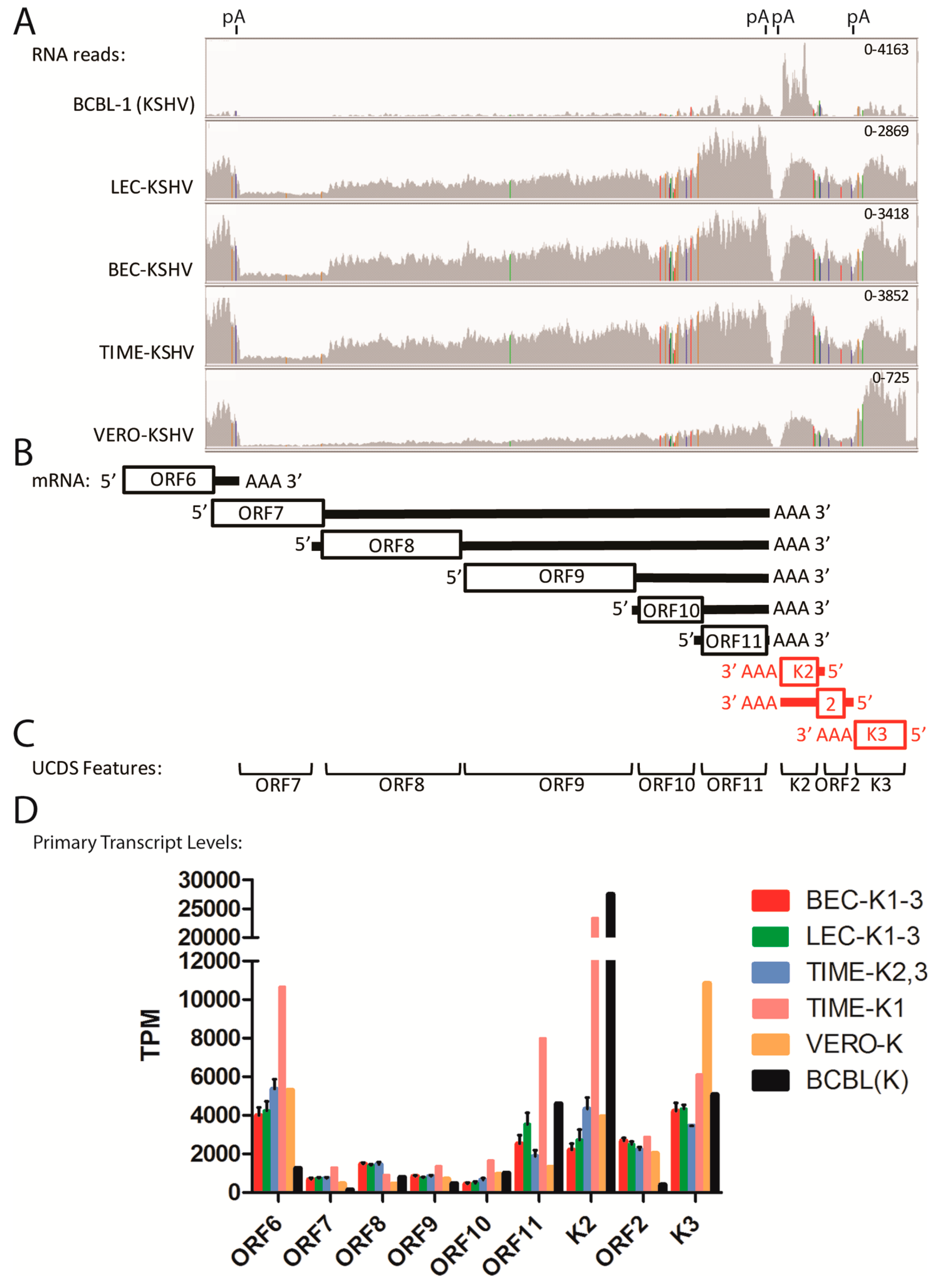 Quantitation of transcripts co-terminating in a common poly(A) site. (A) The RNA reads from the KSHV-infected cell cultures described in Figure 4 were mapped to the KSHV genome and the region from ORF6 to K3 was visualized using IGV (representative data from the KSHV-infected BCBL-1, LEC-K2, BEC-K2, TIME-K2 and Vero-K cells are shown). The positions of known poly(A) (pA) transcription termination sites are shown (see Table 2); (B) The proposed transcription pattern for this region is indicated. The “primary” transcripts for each 5′ proximal ORF are shown with the coding region indicated as an open box and the proposed poly(A) tail and 5′ and 3′ flanking regions indicated with a line (black = sense strand; red = antisense strand; see Table 2); (C) The non-overlapping UCDS features for quantitating transcripts are shown (see Table 3); (D) Reads mapping to the primary transcripts for each ORF were quantitated using the UCDS features and normalized (TPM), with the average and standard deviation determined for the replicate infections (see Table S1 for supporting data). The TIME-K1 infection is analyzed separately from the TIME-K2 and -K3 infections, as discussed in the text.