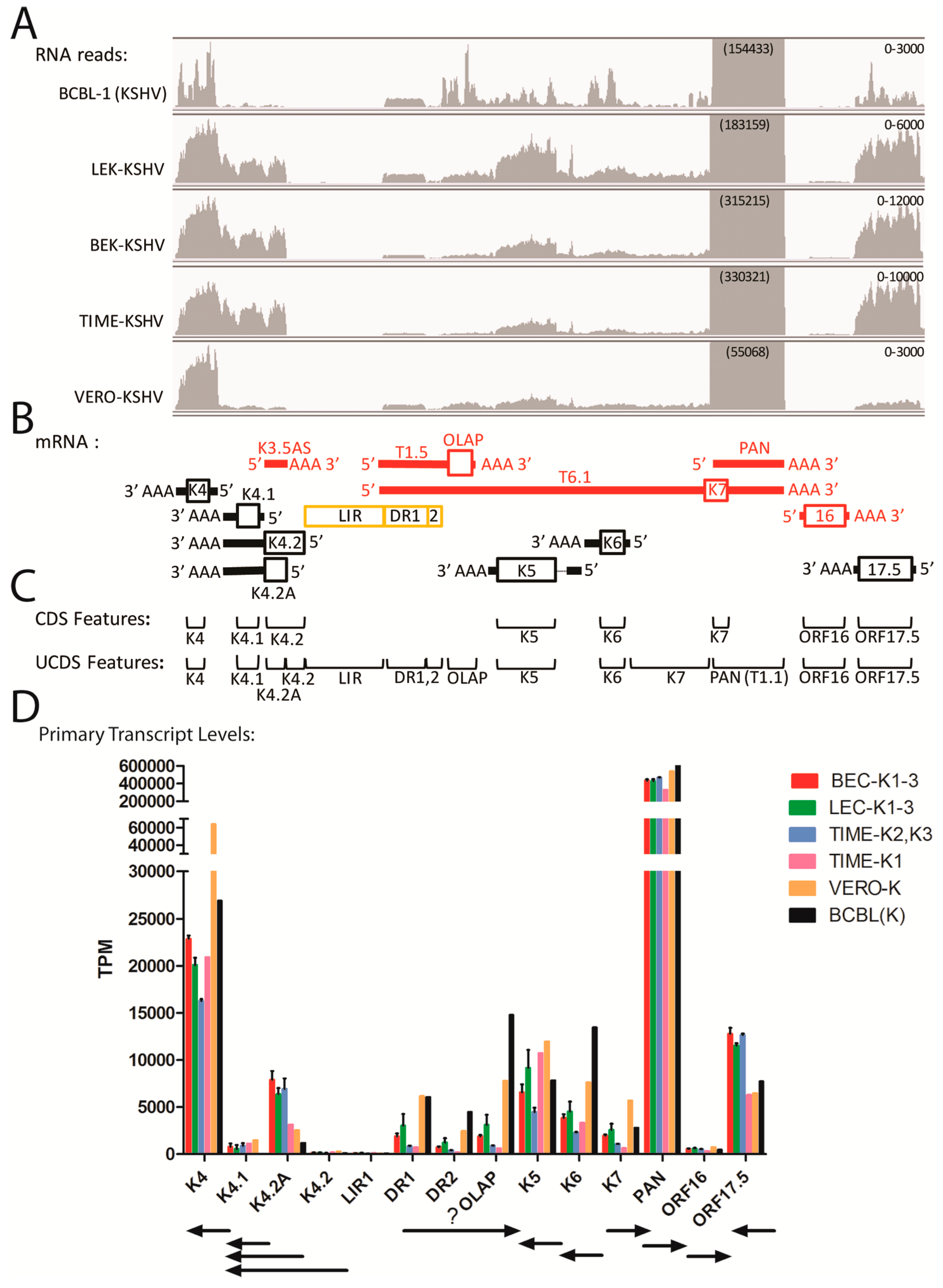 Quantitation of reads mapping to the lytic PAN region (ORFK4-ORF17.5). (A) The RNA reads from the KSHV-infected cell cultures described in Figure 4 were mapped to the KSHV genomic region from ORFs K4 to 17.5 and visualized using IGV (representative data from the KSHV-infected BCBL-1, LEC-K2, BEC-K2, TIME-K2 and Vero-K cells are shown). The range of the vertical axis (read count) is indicated on the right and the depth of reads for the PAN RNA is indicated in parenthesis; (B) the proposed transcription pattern for this region is shown (red and black coloring differentiate transcripts derived from the different DNA strands; see Table 2). The position of a ORFK4.2A truncated transcript encoding only the C-terminal half of ORFK4.2 is indicated, as are the positions of the direct repeats DR1 and DR2 and the long inverted repeat LIR1; (C) the extent of the typical CDS features from the NC_009333 KSHV reference sequence are shown in comparison to the non-overlapping UCDS features developed in this study (see Table 3); (D) Reads mapping to the primary transcripts for each ORF were quantitated using the UCDS features and normalized (TPM) and the average and standard deviation was determined for the replicate infections (see Table 3 and Table S2 for supporting data). The general extent and direction of each transcript is shown.