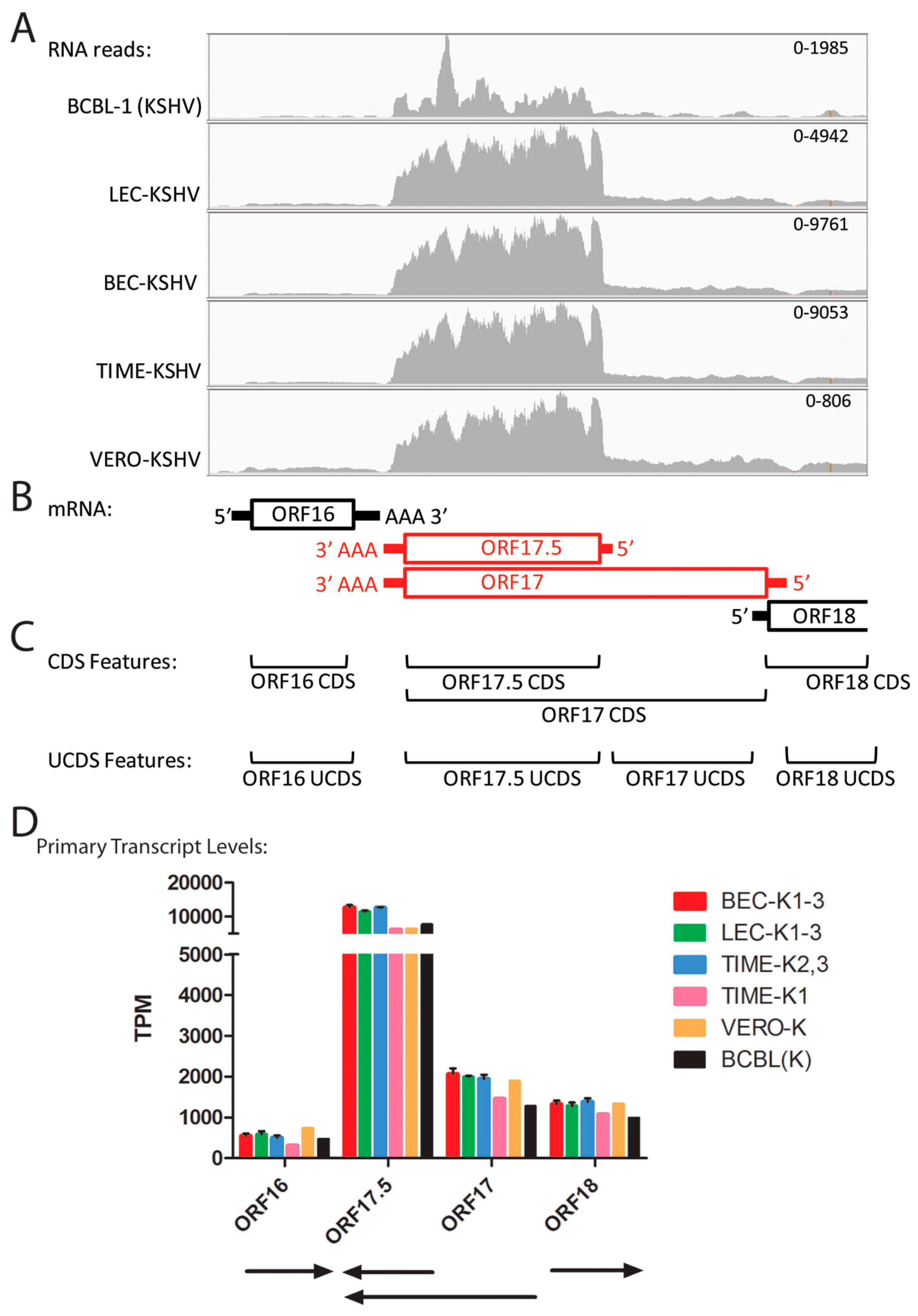 Quantitation of reads mapping to overlapping ORFs (ORF17.5–ORF17). (A) The RNA reads from the KSHV-infected cell cultures were mapped to the KSHV genomic region from ORFs 16 to 18 and visualized using IGV (see Figure 4 legend); (B) The proposed transcription pattern for this region is indicated; (C) The overlapping CDS features from the KSHV reference genome NC_009333 and the non-overlapping UCDS features developed in this study for quantitating transcripts are shown; (D) Reads mapping to the primary transcripts for each ORF were quantitated using the UCDS features and normalized (TPM) and the average and standard deviation were determined for the replicate infections (see Table 3 and Table S3 for supporting data).