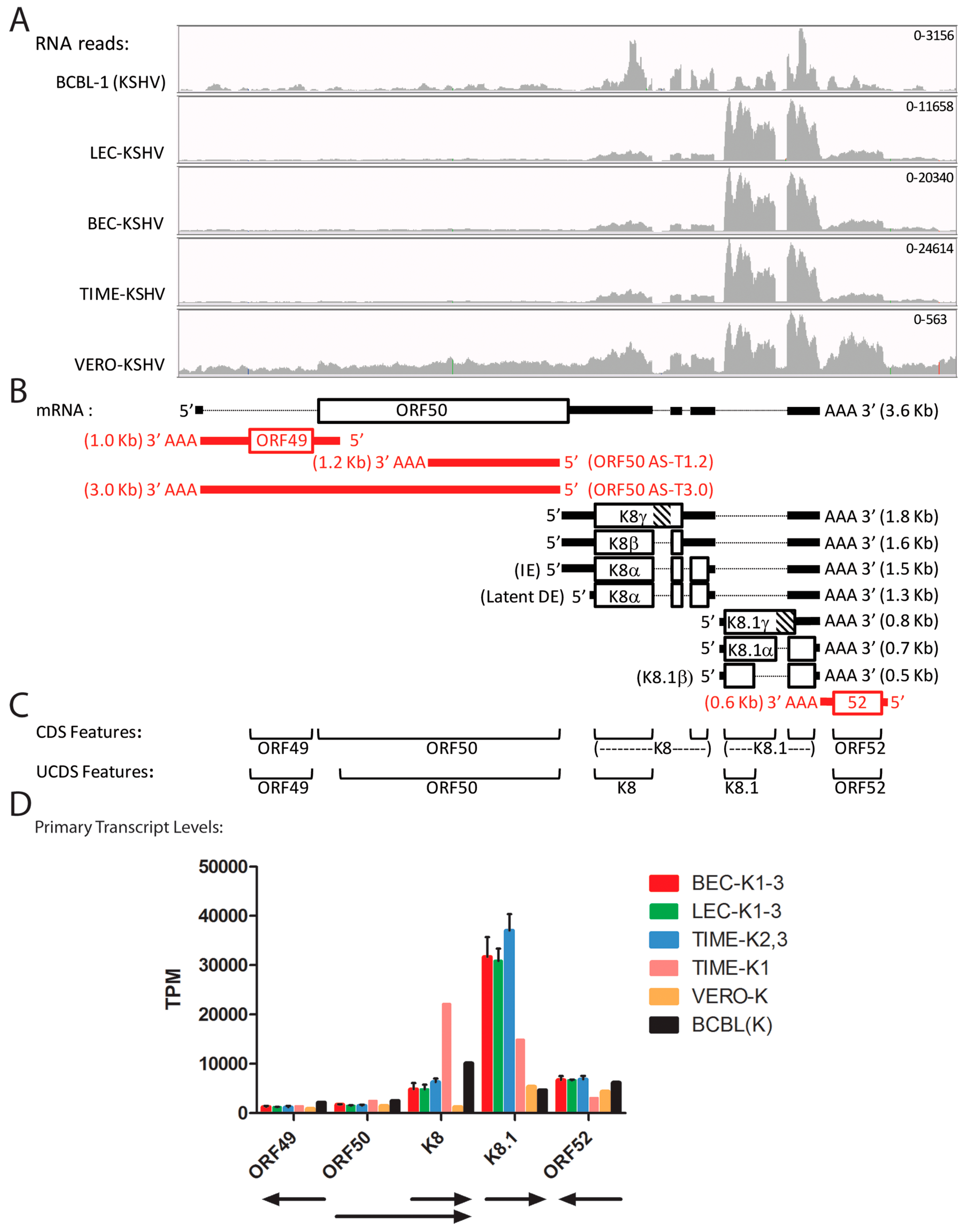 Using the new UCDS features, high levels of the ORFK8.1-specific primary transcript (ranging from 30,682 to 37,000 TPM) were detected in the infected BEC-K1-3, LEC-K1-3 and TIME-K2,3 cells, indicative of late lytic cycle gene expression (Figure 8D; Table S4). Six fold less K8.1 transcripts (4686 TPM) were detected with this feature in BCBL-1 cells, suggesting a more latent phenotype. The TIME-K1 infection was intermediate (14,859 TPM). In contrast, the BCBL-1 cells had higher levels of K8 transcripts (12,701 TPM) than the BEC-K1-3, LEC-K1-3, and TIME-K2, 3 infections (6295–7841 TPM) (Figure 8D; Table S4). Unexpectedly, much higher levels of ORFK8 transcripts were detected in the TIME-K1 infection (24,601 TPM), 3–4 fold higher than the BEC, LEC and other TIME cell infections and twice that detected in BCBL cells (Figure 8D; Table S4). Of note, quantitation of the ORFK8.1 transcripts in the BCBL-1 and TIME-K1 cells using the conventional K8.1 CDS feature targeting the 3′ ORF50/K8/K8.1 common exon (Figure 8C) would have mistakenly identified the high level of ORFK8 reads as a high level of ORFK8.1.