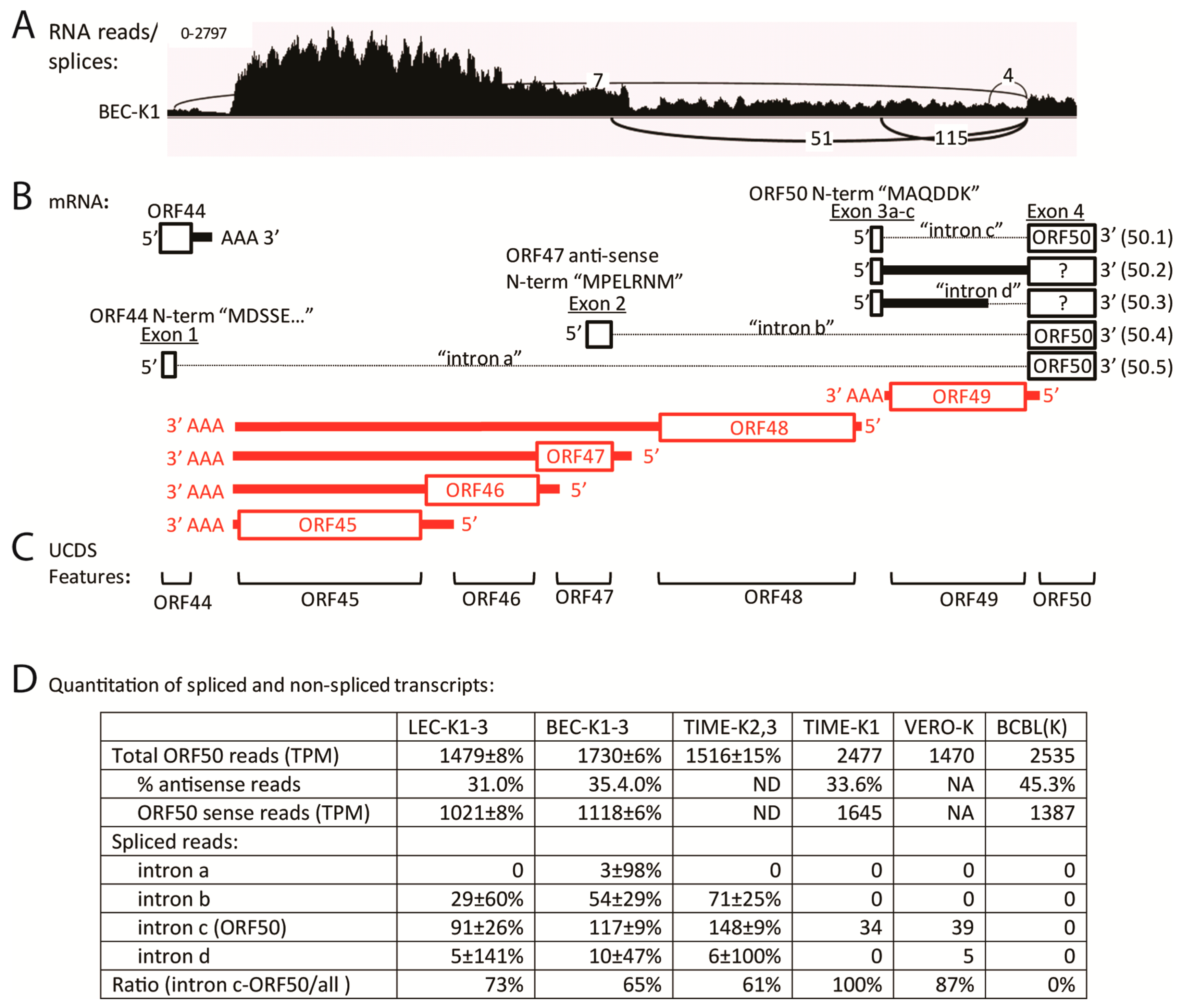 The characteristic ORF50 transcript (herein designated 50.1), encoding the ORF50 isoform 1, is spliced from a small exon encoding the six N-terminal amino acids “MAQDDK” to the larger exon downstream of ORF49, which encodes the majority of the ORF50 coding sequence (Figure 8B and Figure 9B). To determine whether any correctly spliced ORF50.1 transcripts were expressed in the five KSHV-infected cell types, we examined the TopHat2 analysis of the RNA-seq reads and compared this with the total reads mapping to the ORF50 UCDS feature. TopHat2 examines the RNA reads that don’t initially map to the target genome sequence, and detects reads ab initio that are split across exon boundaries, indicating a splice junction. Due to the directionality of the splice junction, the sense of the spliced transcript is determined by the algorithm. A representative IGV Sashimi plot for the BEC-K1 infection (paired-end library) is shown, indicating depths of unspliced reads (vertical axis) and numbers and positions of spliced reads (Figure 9A) in relation to the proposed transcripts (Figure 9B). TopHat2 detected an average of 91, 117 and 148 reads split across the ORF50 splice junction of intron “c”, characteristic of transcript 50.1, in the infected LEC-K1-3, BEC-K1-3 and TIME-K2,3 cells, respectively (Figure 9D). The infected Vero and TIME-K1 cells had 39 and 34 split reads, respectively. In contrast, no ORF50 spliced reads were detected in the latently infected BCBL-1 cells, which had only a low level of sense-strand ORF50 transcripts (1387 TPM).
