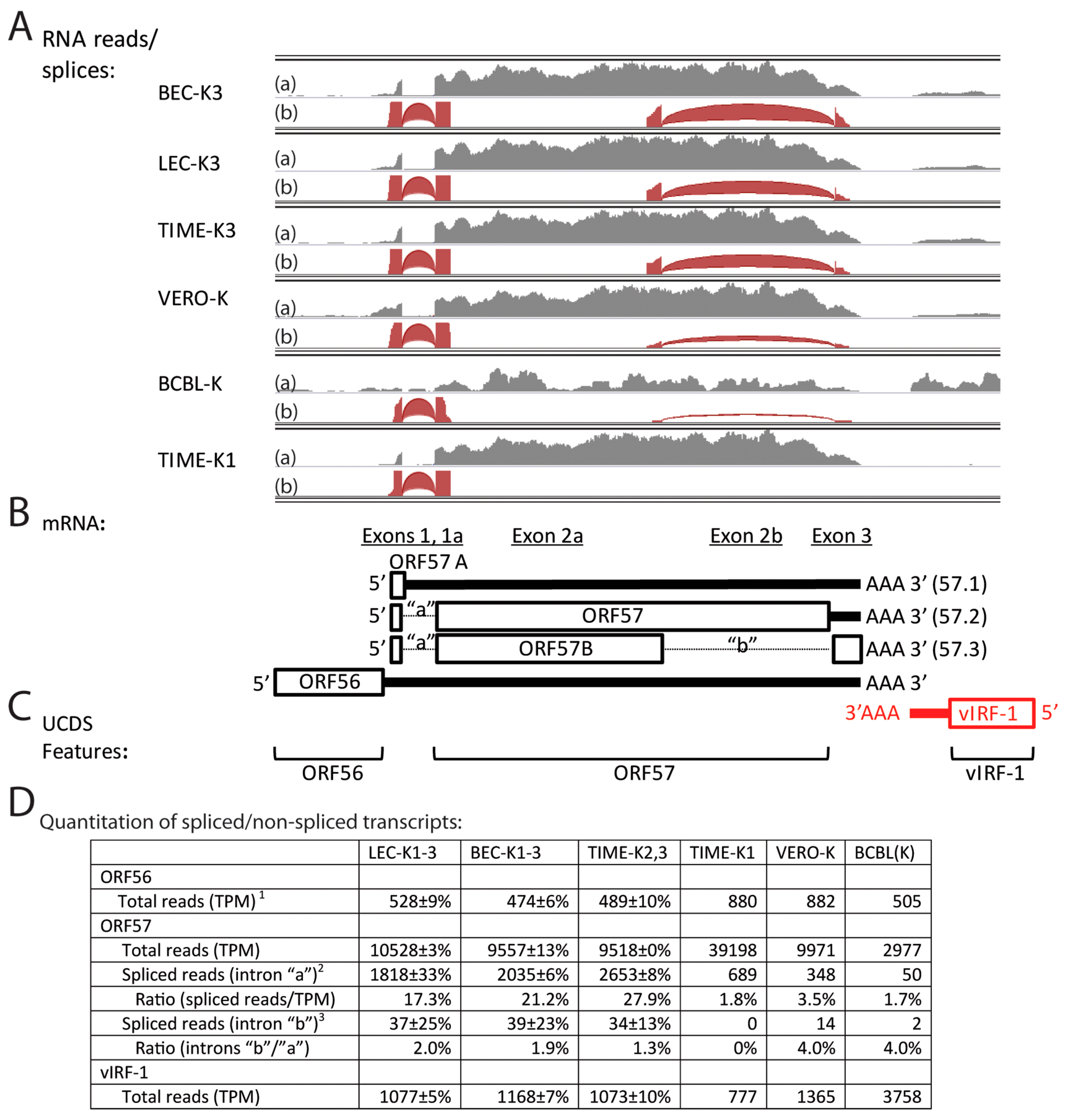 Alternate splicing of ORF57 transcripts. (A) RNA reads from the KSHV-infected cell cultures were mapped to the KSHV genomic region from ORF56 to vIRF-1(K9), and representative data for spliced and un-spliced reads were visualized using IGV (see Figure 4 legend). Depth of total mapped reads (dark gray-top section (a)) and spliced reads (brown-bottom section (b)) are shown on the vertical axis. The number of split reads is indicated by an arc from the beginning to the end of the junction and the height and thickness of the arc are proportional to the depth of read coverage up to 50 reads; (B) Proposed mRNA transcript structure; the unspliced 57.1 transcript encodes the 28 aa ORF57A as a 5′ proximal ORF; the single spliced 57.2 transcript encodes the full length 455 aa ORF57; the double spliced 57.3 transcript encodes a truncated 299 aa ORF57B with a novel C-terminal domain (see Figure S5 for encoded sequences). ORFs on the sense strand are shown in black, while ORFs on the complementary strand are shown in red; (C) position of UCDS features for read quantitation; (D) Total reads mapping to the UCDS features were quantitated and normalized (TPM). Split reads detected by TopHat were quantitated across introns “a” and “b”.