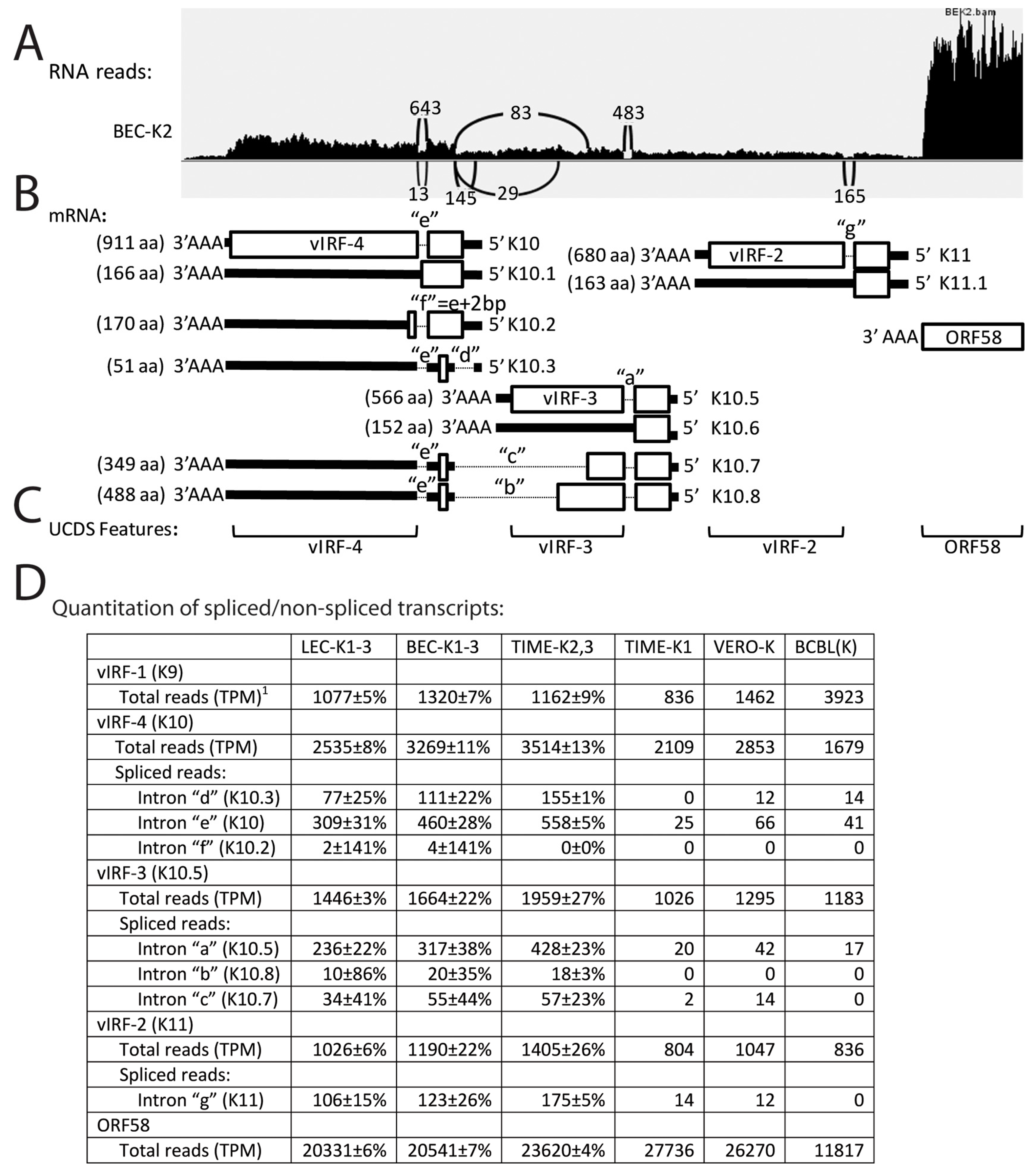 Alternate splicing of vIRF transcripts. RNA reads from the KSHV-infected cell cultures were mapped to the KSHV genomic region from vIRF-4 (K10) to ORF58. (A) An IGV Sashimi plot from TopHat analysis of split reads mapping across intron junctions of alternate vIRF transcripts; total RNA read depth is indicated in the vertical axis (representative data from the BEC-K2 infection). The position and number of split reads mapping across the intron junctions are shown; (B) the proposed transcription pattern for this region is indicated, with 5′ proximal exon coding regions boxed, adjacent 5′ and 3′ regions as solid lines, and intron regions as small dotted lines. The spliced K10 transcript encodes the 911 aa full length K10/vIRF-4; the unspliced K10.1 transcript encodes a 166 aa extended N-terminal domain of K10; the alternately spliced K10.2 transcript encodes a 170 aa isoform of the N-terminal domain of K10 with an alternate C-terminal peptide; the doubly spliced K10.3 transcript encodes a 51 aa peptide from an alternate frame of the K10 N-terminal domain; The spliced transcript K10.5 encodes the 566 aa full length K10.5/vIRF-3; the unspliced transcript K10.6 encodes the 152 aa N-terminal domain of K10.5; the triple spliced transcript K10.7 encodes a short truncation of K10.5 with the same C-terminal sequence encoded by K10.3 transcript; the triple spliced transcript K10.8 encodes a long truncation of K10.5 with the same C-terminal sequence encoded by K10.3 and K10.7. The spliced transcript K11 encodes the full length 680 aa K11/vIRF-2; the unspliced transcript K11.1 encodes the 388 aa N-terminal domain of K11 (see Figure S6 for encoded sequences); (C) The non-overlapping UCDS features for quantitating transcripts are shown. These features quantitate reads to the 3’ common exon and do not distinguish the different isoforms; (D) Total reads mapping to the UCDS features were quantitated and normalized (TPM) with the average and standard deviation for the replicate infections. Split reads detected by TopHat were quantitated across introns “a–g”.
