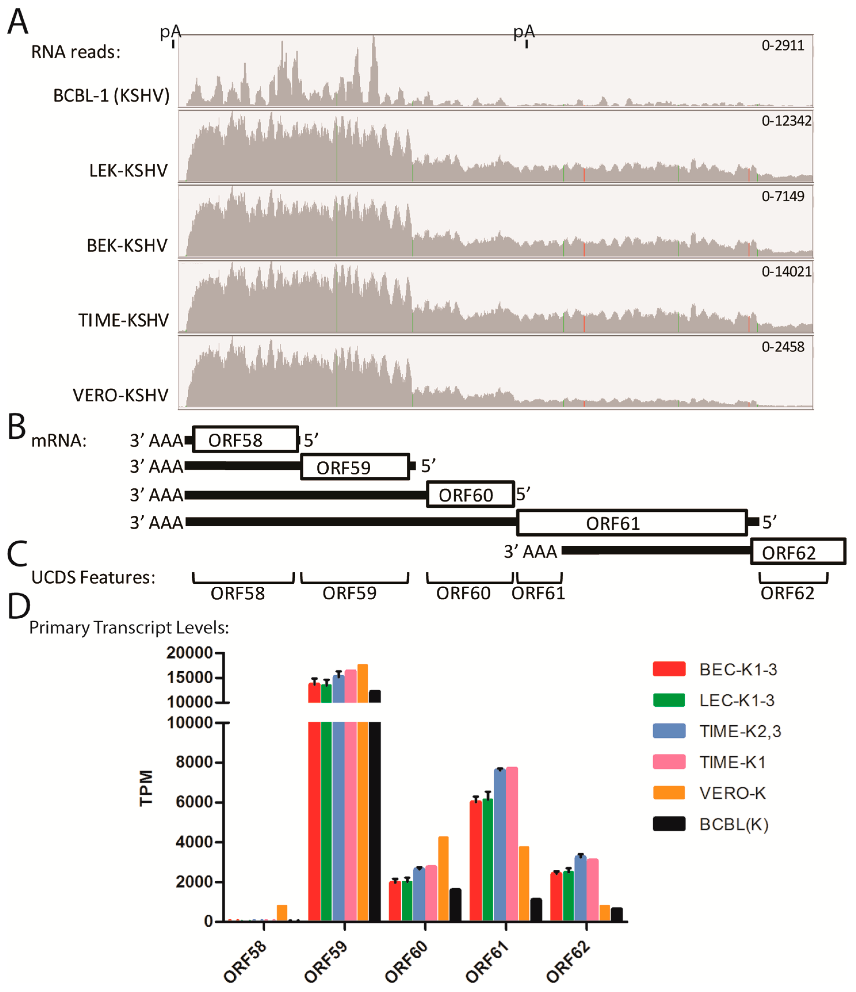 The mapped reads in the ORF7-K3 region indicated that each ORF had its own adjacent promoter. In other regions, the mapped reads indicated that some transcripts were bicistronic with no evidence for a promoter driving additional expression of transcripts encoding only the distal ORF. High levels of reads in the five cell types mapped to ORF58 and ORF59 (Figure 12A). ORF58 is a homolog of EBV BMRF2, a multiple-pass transmembrane protein with unknown function, and ORF59, an early lytic protein, encodes a DNA polymerase processivity factor involved in DNA replication. Multiple transcripts encoding ORFs 62, 61, 60, 59 and 58 have been detected [54]. We developed non-overlapping UCDS features targeting these ORFs and quantitated gene expression (Figure 12B,C). All five cell lines showed high levels of reads mapping to the ORF58 UCDS (ranging from 11,817 TPM in BCBL-1 cells to 27,736 TPM in TIME-K1 cells) and to the ORF59 UCDS (ranging from 14,879 TPM in BCBL-1 cells to 28,672 TPM in the TIME-K1 cells) (Table S7). A gradient of total reads mapping to the UCDS features of ORF62, ORF61, ORF60 and ORF59 was observed in all cell lines (Table S7). This was compatible with the pattern of primary transcripts for each of these ORFs indicated in Figure 12B. The reads mapping to the primary transcripts, in which the designated ORF is 5′ proximal, were calculated (Table S7) and compared (Figure 12D and Figure S7). The transcript from the ORF59 promoter, which is bicistronic with the distal ORF58, was highly expressed across all 5 KSHV-infected cell types, including the TIME-K1 cells. While no evidence for a transcript from the ORF58 promoter was observed in the infected endothelial or BCBL-1 cells, a low level of the ORF58 primary transcript was detected in Vero cells (794 TPM) (Figure 12D; Table S7). Variable low level expression of the primary ORF60 and 62 transcripts was seen across the 5 cell types, with the lowest expression seen in the BCBL-1 cells. The primary ORF61 transcript was expressed at higher levels than ORFs 60 and 62 with the highest expression detected in the TIME cell infections (Figure 12D; Table S7).