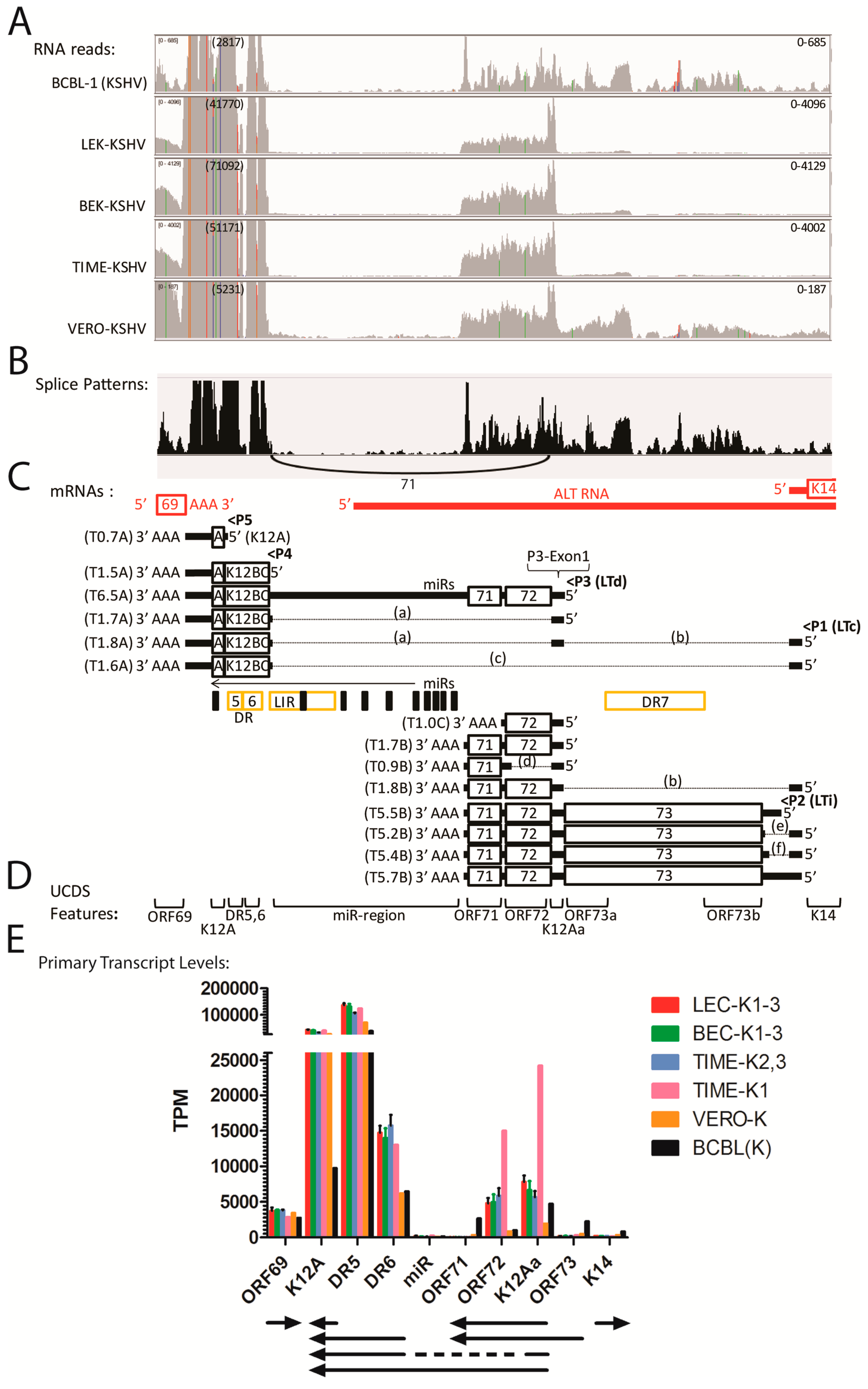 Quantitation of reads mapping to the latency region. (A) RNA reads from the KSHV-infected cell cultures were mapped to the KSHV genomic region from ORF69 to K14, and representative data were visualized using IGV (see Figure 4 legend). The range of the vertical axis (read count) was scaled to the ORF71/72 read depth indicated on the right and the depth of reads for the K12 region is indicated in parenthesis on the left; (B) Representative spliced transcript pattern (Sashimi plot) for latently infected BCBL-1 cells is shown. The number and position of reads split between the upstream and downstream exons are indicated; (C) The proposed transcription pattern for this region is shown (black = sense strand; red = antisense strand) [23,55,56,57,58,59,60,61]. The proposed non-coding antisense ALT RNA and the positions of the direct repeats DR5, 6 and 7, the indirect repeat LIR and the microRNA region (miRs) are indicated. Coding sequences are boxed, adjacent 5′ and 3′ regions are thick lines and introns (a–f) are indicated as thin dotted lines. The positions of the promoters for the latency transcripts are indicated: P1 (LTc; bp 128,815), P2 (LTi; bp 127,789), P3 (LTd; bp 124,055), P4 (~bp 119,035), and P5 (~bp 118,234) promoters and the known latency transcripts are graphically represented and are grouped according to their use of the polyA termination sites at bp 117,548 (Group A), bp 122,337 (Group B) and bp 123,010 (Group C), and the predicted sizes were determined from the GK18 NC_009333 reference sequence; (D) The non-overlapping UCDS features developed in this study for quantitating transcripts are shown. The miR UCDS feature identifies reads from the unspliced T6.5A transcript, which map to the genomic region encoding the micro RNAs. The miR UCDS feature in our study does not detect processed miRNAs, as these RNAs are not polyadenylated and thus are not sequenced in the RNA-seq library. The K12Aa UCDS feature identifies reads mapping to the short 5′ exon upstream of ORF72 (P3-Exon1), which is present in several spliced and unspliced transcripts in this region. The ORF73a and ORF73b UCDS features target the non-repetitive parts of the ORF73 transcript, and reads are combined for TPM normalization. The DR6 UCDS feature targets an extremely GC-rich repetitive region, which may be poorly amplified in the library preparation. E) Reads mapping only to the primary transcripts for each ORF were quantitated using the UCDS features and normalized (TPM) with the average and standard deviation determined for the replicate infections (see Table S8 for supporting data).