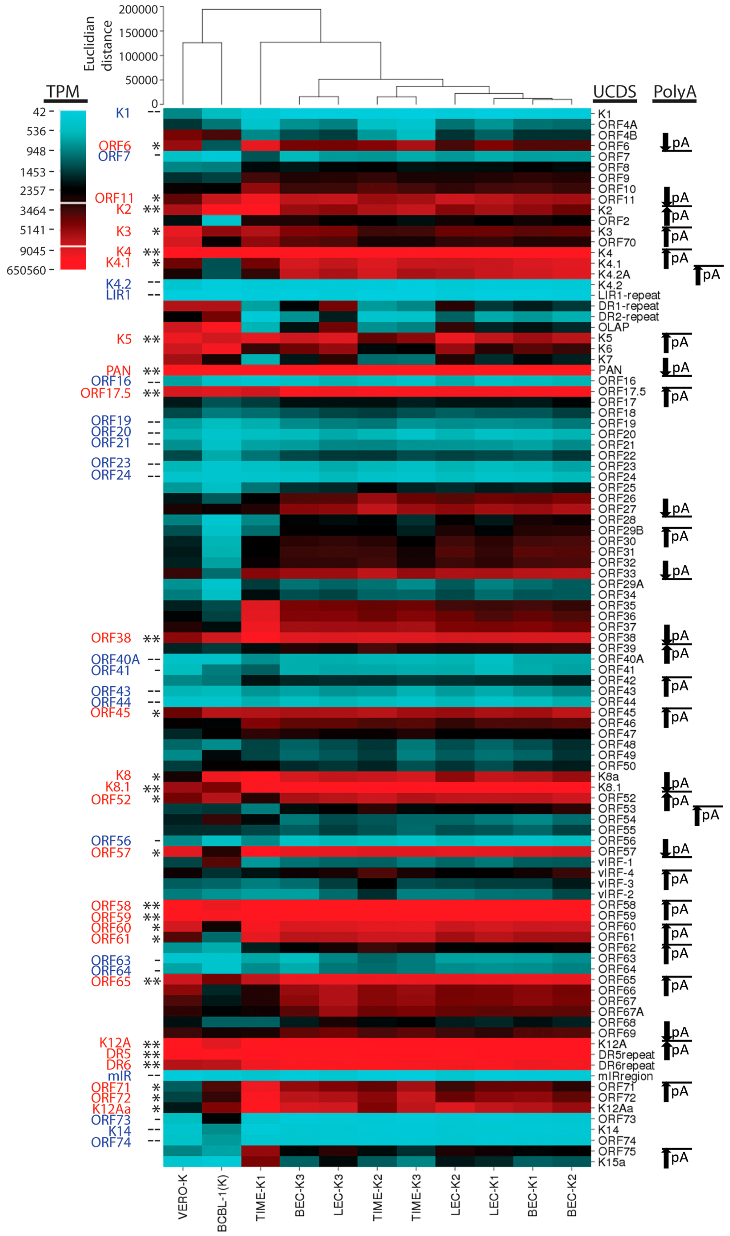 Hierarchical clustering of KSHV transcripts in cells undergoing latent KSHV infection. Hierarchical clustering was applied to viral gene expression data obtained by mapping RNA reads to UCDS gene features from triplicate independent latent KSHV infections of LEC, BEC and TIME cells, a single latent infection of Vero cells at 48 h post infection, and a single analysis of BCBL-1 cells carrying a latent KSHV infection. Total reads mapping to each KSHV UCDS feature were quantitated and normalized (TPM). The types of infected cells and replicate infections are indicated at the bottom of the analysis. UCDS features (described in Table 3) are indicated on the right hand side. Clustering of viral gene expression for the different infected cells is indicated (top horizontal axis) in the context of the order of genes within the KSHV genome (vertical axis). Expression levels are indicated (red (*) = strong; blue (-) = weak) and genes with consistent expression across the different cell types are shown on the left hand side (**/--: very consistent; */-: moderately consistent). The position of poly(A) transcription termination sites are indicated (pA) with arrows showing the extent of loci terminating at a common poly(A) transcription terminate site.