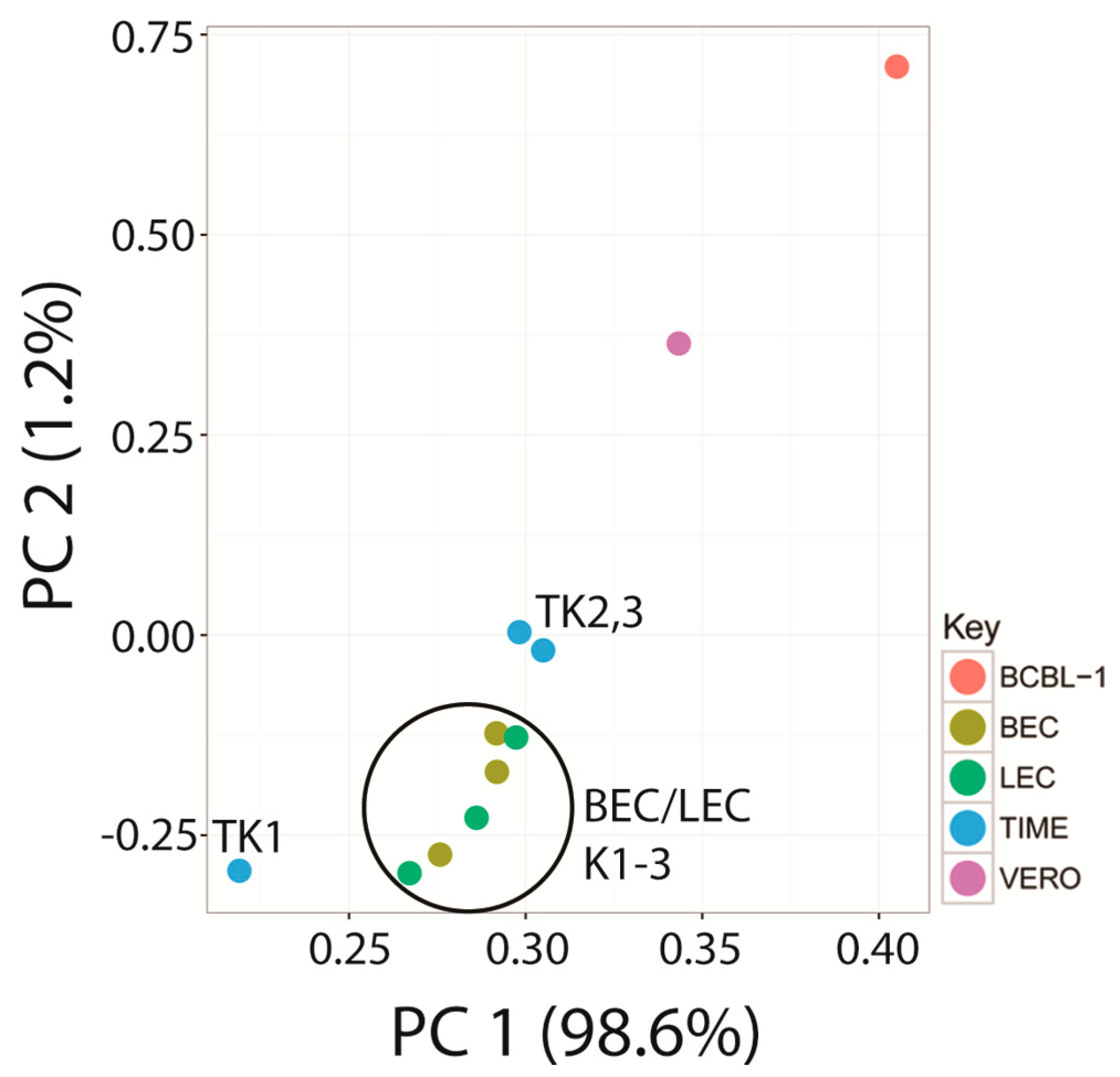 KSHV virions from culture medium of TPA-treated BCBL cells were concentrated approximately 200-fold by centrifugation onto an Opti-Prep cushion, as described previously [79]. The TIME, LEC, and BEC cells were infected in parallel with the same KSHV virion preparation on three different days (triplicate biological replicates). KSHV virions were titered previously and sufficient virus to infect >90% of the cells was used in the infection. The KSHV infections of endothelial cells were performed in serum-free EBM-2 supplemented with 8 μg/mL polybrene for 4 h, after which the medium was replaced with complete EGM-2. 30% more KSHV virion inoculum was used to infect the primary LEC and BEC cell cultures compared to the immortalized TIME cell lines to obtain similar infection rates. Infection rates were assessed by immunofluorescence for all experiments, using antibodies against the latency-associated nuclear antigen (LANA) and the lytic protein ORF59. KSHV infection of Vero cells was performed in a similar manner to the TIME cells, but in DMEM containing 10% FBS.