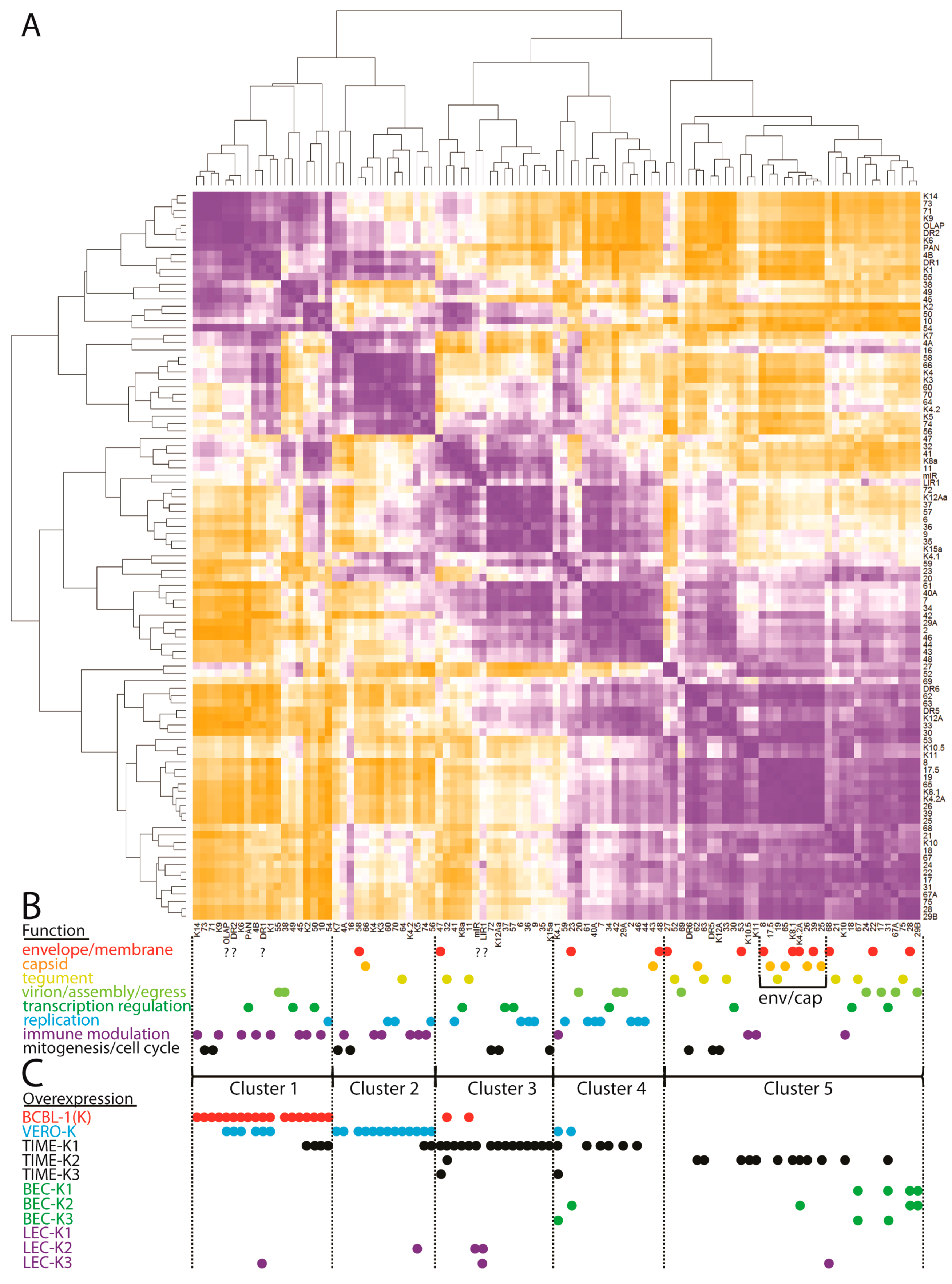 - Brulois, K.; Wong, L.Y.; Lee, H.R.; Sivadas, P.; Ensser, A.; Feng, P.; Gao, S.J.; Toth, Z.; Jung, J.U. Association of Kaposi’s sarcoma-associated herpesvirus ORF31 with ORF34 and ORF24 is critical for late gene expression. J. Virol. 2015, 89, 6148–6154. [Google Scholar] [CrossRef] [PubMed]