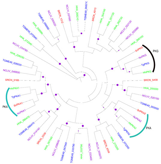 Mid-point rooted ML phylogenetic tree of apicomplexan OPKs. The terminal branches are color-coded for AGCs in the kinomes of S. neurona (SRCN; red), T. gondii, ME-49 strain (TGME49; blue), H. hammondi (HHA; green) and N. caninum, Liverpool strain (NCLIV; purple). A solid purple circle on a branch indicates bootstrap support greater than 70. The phylogenetic tree was inferred from a multiple sequence alignment using PhyML with the LG amino acid substitution model and the gamma model of substitution rate heterogeneity. The tree image was rendered with iTOL.