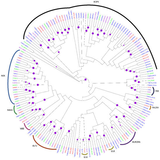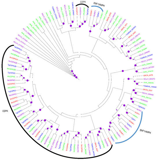 Mid-point rooted ML phylogenetic tree of apicomplexan CAMKs. The terminal branches are color-coded for AGCs in the kinomes of S. neurona (SRCN; red), T. gondii, ME-49 strain (TGME49; blue), H. hammondi (HHA; green) and N. caninum, Liverpool strain (NCLIV; purple). A solid purple circle on a branch indicates bootstrap support greater than 70. The phylogenetic tree was inferred from a multiple sequence alignment using PhyML with the LG amino acid substitution model and the gamma model of substitution rate heterogeneity. The tree image was rendered with iTOL.