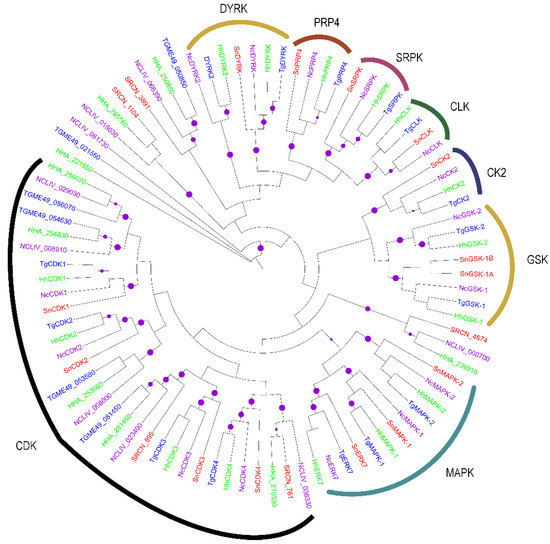 Mid-point rooted ML phylogenetic tree of apicomplexan CMGCs. The terminal branches are color-coded for AGCs in the kinomes of S. neurona (SRCN; red), T. gondii, ME-49 strain (TGME49; blue), H. hammondi (HHA; green) and N. caninum, Liverpool strain (NCLIV; purple). A solid purple circle on a branch indicates bootstrap support greater than 70. The phylogenetic tree was inferred from a multiple sequence alignment using PhyML with the LG amino acid substitution model and the gamma model of substitution rate heterogeneity. The tree image was rendered with iTOL.