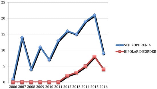 The implication of infectious agents, particularly Toxoplasma gondii (T. gondii), in the development of major psychosis has recently gained increasing attention [15,16,17,18,19,20,21]. In the last decade, the number of publications dealing with the relationship between toxoplasmosis and schizophrenia or BD has dramatically increased, as shown in Figure 1. However, the role of infectious agents remains controversial, and to date, no clear cause-effect etiopathogenetic relation can be established.