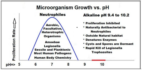 Most pathogenic microorganisms that survive in humans are neutrophils [,], because of the tightly controlled near-neutral pH required in most bodily fluids required for humans to survive. According to Lengeler, Drews, and Schlegel [], each organism has a unique niche, and it biochemically struggles or dies when exposed to a pH range significantly outside this niche. An exception, Helicobacter pylori, is likely the most common non-neutrophile human bacterial infection and according to Brown [] it inhabits the stomachs of half of the people on Earth, without symptoms. H. pylori can survive in a wide range of pH values and are ubiquitous among humans, therefore such exceptions are moot and not relevant to this review. Logically, if neutrophile environmental water pH is shifted significantly from the neutral range, typical pathogens affecting humans and their host protozoa will not survive. If protozoan hosts react to the inhospitable conditions by reverting to their cyst form, the continuous hostile conditions will prevent their proliferation and effectively isolate the pathogen from humans at sufficient disease inducing concentrations.