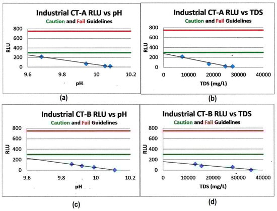 Cooling tower water planktonic bacterial RLU (ATP) values vs. pH and TDS. (a) Shows RLU vs. pH for CT-A. (b) Shows the RLU vs. TDS for CT-A. (c) Shows RLU vs. pH for CT-B. (d) Shows RLU vs. TDS for CT-B. The linear inhibitory effects of increased pH and TDS vs. ATP (RLU) values measured in two industrial cooling tower systems [], the green acceptable control limit line at 300 RLU and the red out-of-control limit line at 800 RLU, demonstrate reduced RLU (ATP) values and therefore the reduced microbiological masses in both systems as the pH and TDS values increase [].