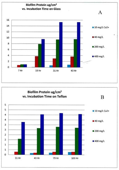 As 10, 40, 200, and 400 mg/L of calcium (Ca2+) is added to minimum marine medium (MMM) inoculated with biofilm forming bacteria, the total cellular protein of Pseudoalteromonas spp. biofilms associated with (A) glass and (B) Teflon surfaces increased with time, directly with the increasing concentration of calcium ion. (Graph generated with data from []).