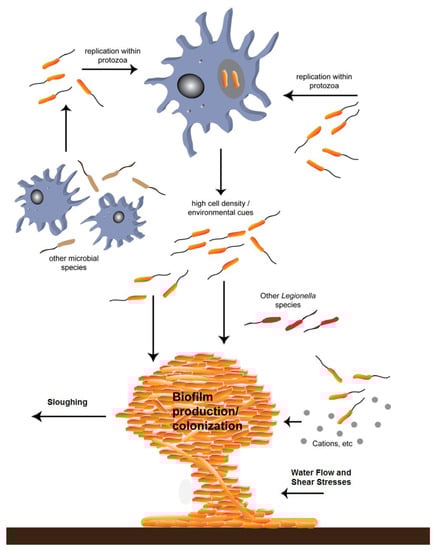Biofilm formation-Legionella parasitic infestation of protozoa and effects of water flow on sloughing and redistribution of planktonic L. pneumophila in cooling water systems. (Image modified from []).