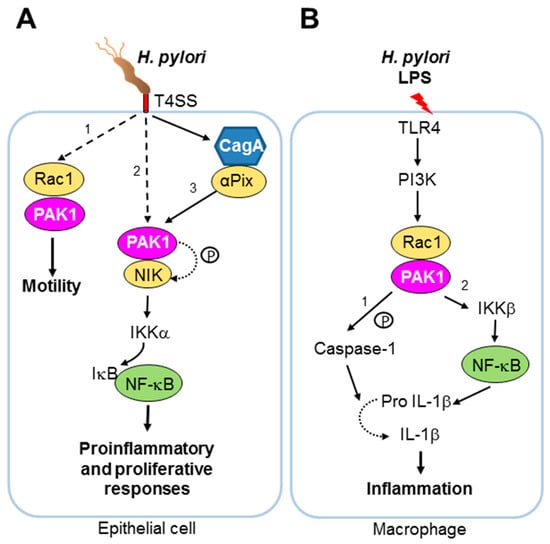 - Foryst-Ludwig, A.; Naumann, M. P21-activated kinase 1 activates the nuclear factor kb (NF-kappaB)-inducing kinase-ikb kinases NF-kappaB pathway and proinflammatory cytokines in Helicobacter pylori infection. J. Biol. Chem. 2000, 275, 39779–39785. [Google Scholar] [CrossRef] [PubMed]