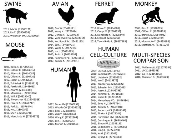 10. Go, J.T.; Belisle, S.E.; Tchitchek, N.; Tumpey, T.M.; Ma, W.; Richt, J.A.; Safronetz, D.; Feldmann, H.; Katze, M.G. 2009 pandemic H1N1 influenza virus elicits similar clinical course but differential host transcriptional response in mouse, macaque, and swine infection models. BMC Genom. 2012, 13, 627. [Google Scholar] [CrossRef] [PubMed]