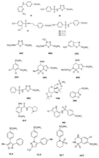 - Carta, F.; Supuran, C.T.; Scozzafava, A. Sulfonamides and their isosters as carbonic anhydrase inhibitors. Future Med Chem. 2014, 6, 1149–1165. [Google Scholar] [CrossRef] [PubMed]