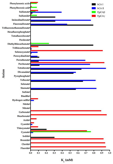 - Del Prete, S.; Vullo, D.; De Luca, V.; Carginale, V.; di Fonzo, P.; Osman, S.M.; AlOthman, Z.; Supuran, C.T.; Capasso, C. Anion inhibition profiles of alpha-, beta- and gamma-carbonic anhydrases from the pathogenic bacterium Vibrio cholerae. Bioorgan. Med. Chem. 2016, 24, 3413–3417. [Google Scholar] [CrossRef] [PubMed]