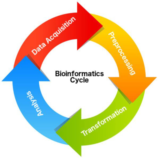 Example for data lifecycle in bioinformatics. The lifecycle begins with data acquisition, through data pre-processing, data transformation, and, finally, the analysis of the results (information) generated by this process.