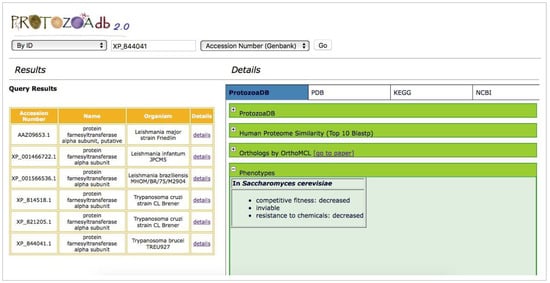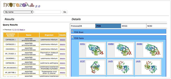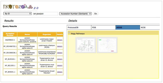 The system has been fully remodeled to allow for new tools and a more expanded view of data, using advanced computational techniques and providing a wider range of information for users. Now with the genomes of 22 pathogenic Protozoa, this new version includes analyses such as: (i) similarities with other databases (Homo sapiens, model organisms, Conserved Domains Database—CDD and Protein Data Bank—PDB); (ii) visualization of the metabolic pathways of Kyoto Encyclopedia of Genes and Genomes—KEGG [10]; (iii) protein structures by PDB [11]; (iv) homology studies, using results from OrthoMCL [12], KEGG Orthology (KO), and OrthoSearch [13]; (v) the search for related publications at PubMed; (vi) superfamily classification [14]; and (vii) phenotype inferences based on comparisons with model organisms, particularly with Saccharomyces cerevisae.