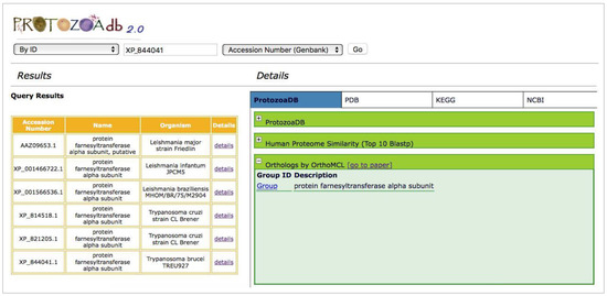 ProtozoaDB 2.0 allows a more detailed analysis of the object of study, and expands the number of genomes and proteomes available to the scientific community. In our case study, a group of protein prenyltransferases was found by just browsing through the results provided by the web service-based tools, developed for this new version. This protein is already described in the literature as a good drug target for trypanosomatids for the following reasons: (i) its inhibitors have potent activity against cultured forms of these parasites and these inhibitors are more toxic against parasite cells than mammalian cells; (ii) for T. brucei PFT (TbPFT), the substrate specificities and inhibitor selectivity are distinct from mammalian PFT; and (iii) efforts of the pharmaceutical industry to develop small molecule inhibitors of mammalian PFTs for anti-cancer purposes creates an abundance of compounds that can be screened for selective activity against parasites. We were able to identify this potential drug target using only an “In Silico”-based strategy and the information available in public databases integrated was into ProtozoaDB 2.0.